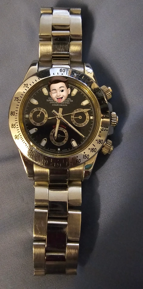 Stainless steel bracelet. Black dial. Chronograph functions. Pre-owned. Good condition. More pictures upon request. One of the arrows fell off, but it doesn't interfere with the watch at all; it all works well.