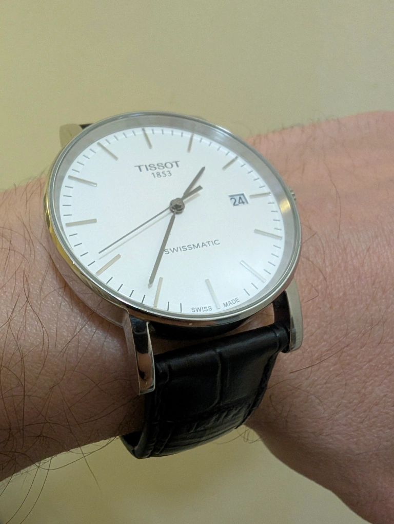 Elegant Tissot wristwatch. Features a white face, black leather band, and date display. Swiss made.