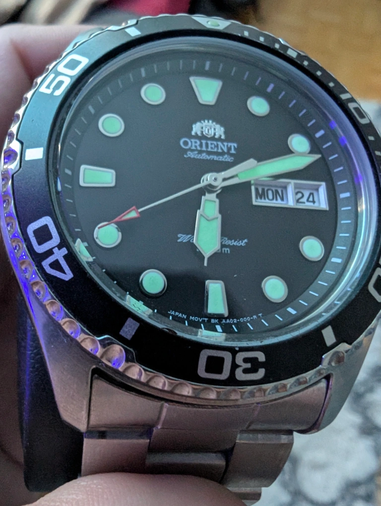 Men's Orient automatic watch. Black face, luminous markers, stainless steel bracelet. Day and date display. Water resistant.