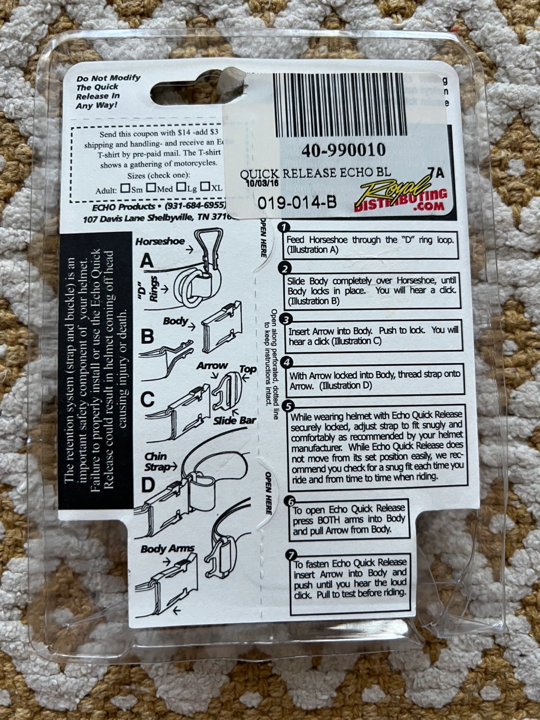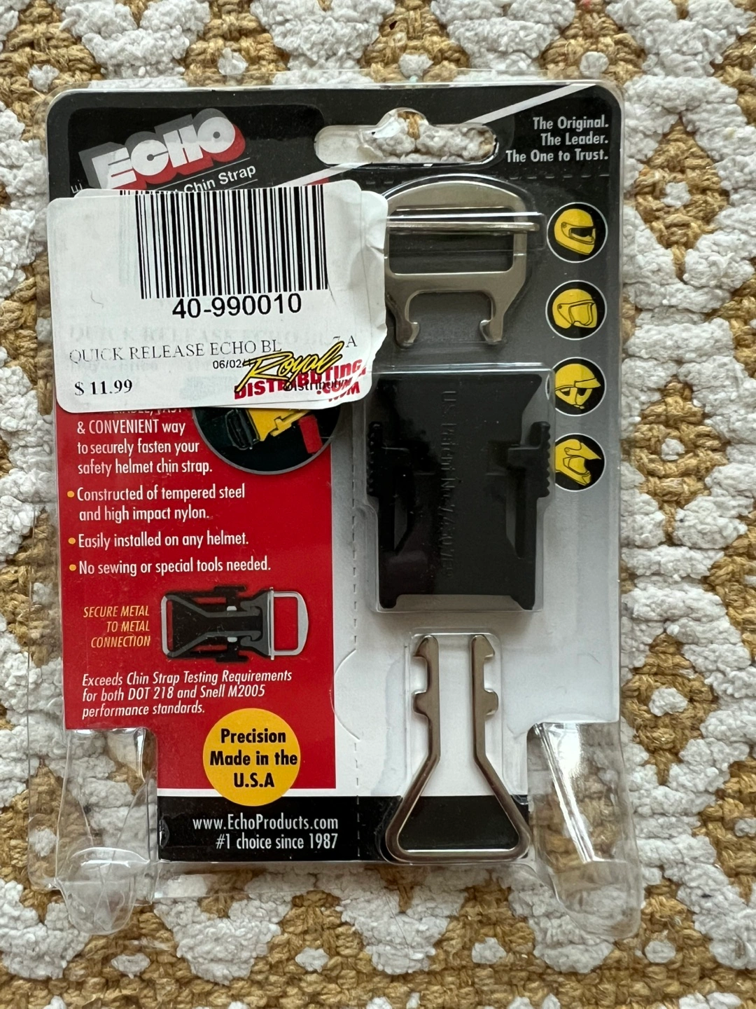 Convenient way to securely fasten your motorcycle helmet strap. Constructed of tempered steel and high impact nylon. Easily installed on any helmet. No sewing or special tools needed. Exceeds chin strap testing requirements. Pick up only