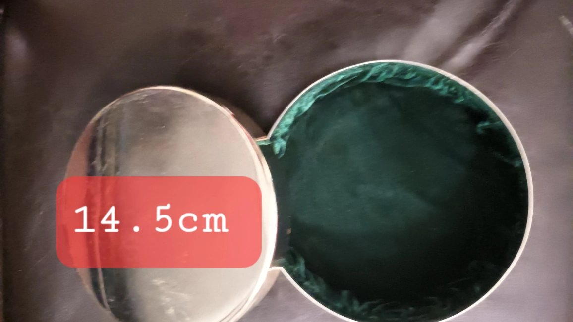 Circular silver-plated trinket box. Measures 14.5cm in diameter. Features a hinged lid and a dark green velvet interior. Perfect for storing small jewellery