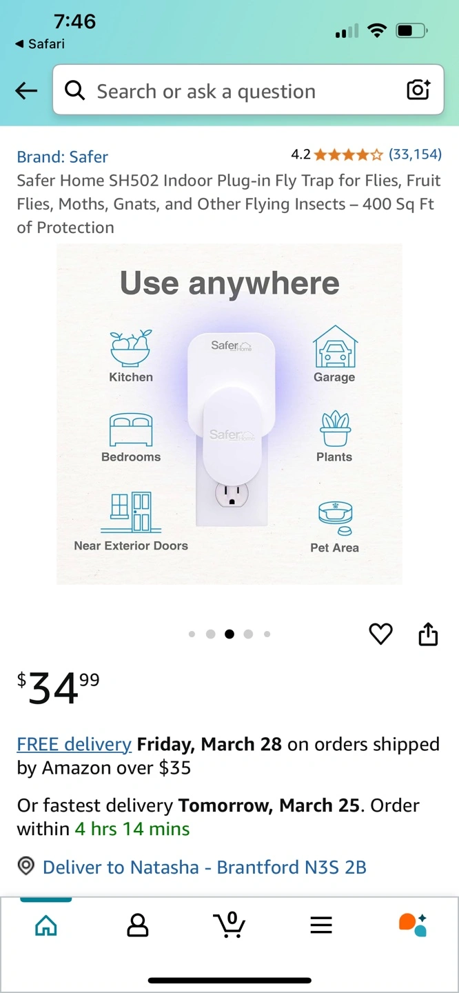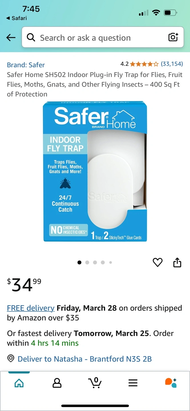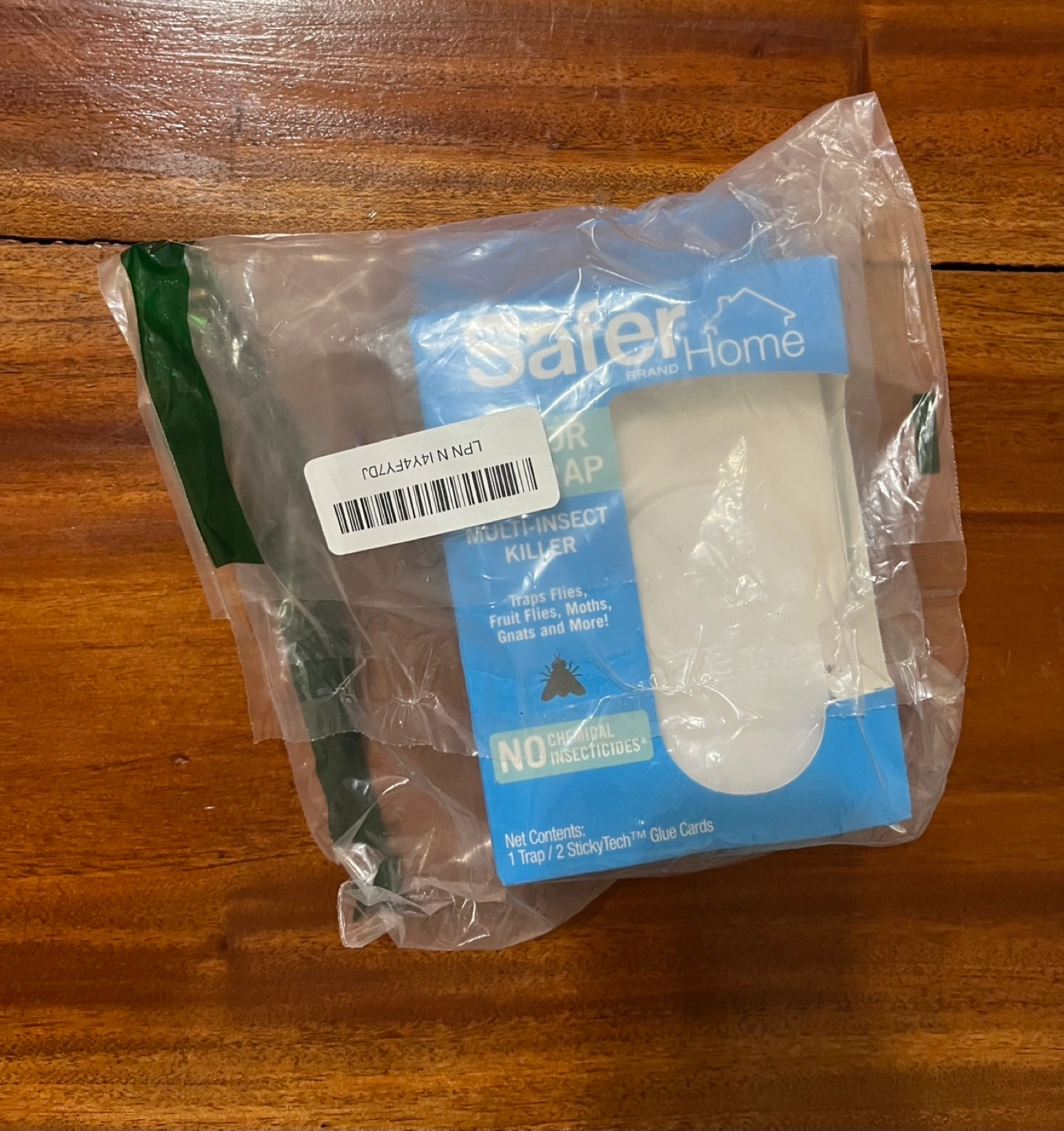 Safer Home brand, indoor plug-in fly trap. Catches flies, moths, gnats, and fruit flies. 400 sq ft protection. Chemical-free. Includes trap and two sticky glue cards.