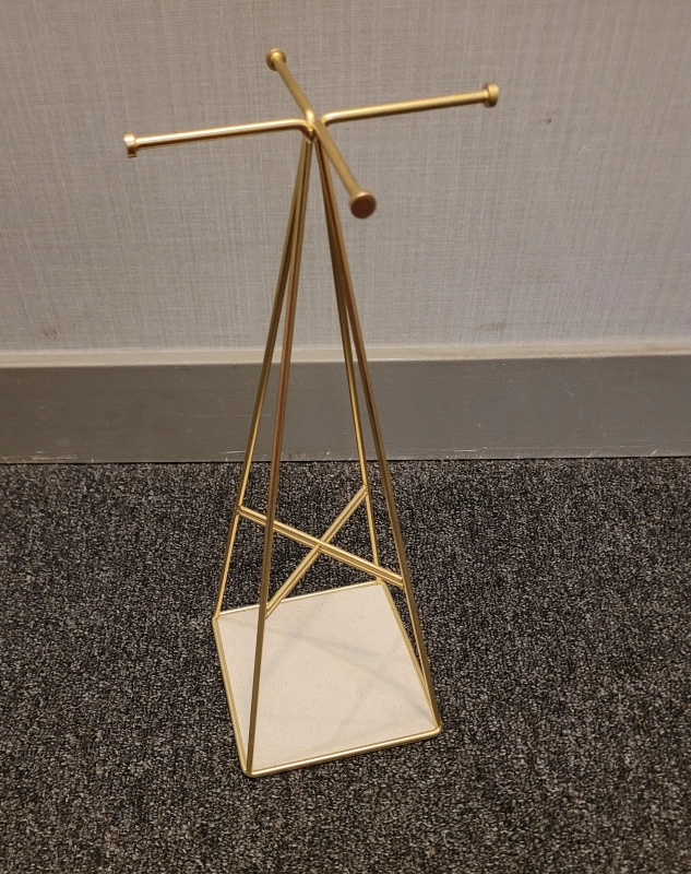 overall great condition. New one costs 30 dollars + tax on Amazon. Designed after our popular Prisma photo frames, the Prisma Jewelry Stand is a stylish way to store and display your favorite jewelry. With Prisma Jewelry Stand metal wire with a modern matte brass finish has been shaped into a narrow pyramid shape and has spokes on the top, intended to hang jewelry on. This piece makes excellent use of vertical space for storing accessories, but also can add a dynamic layer of height to a Collection of decorative items on your vanity, countertop or dresser top. It measures 5.38 x 5.38 x 14.25" (14 x 14 x 36 cm). Prisma’s linen base doubles as storage for smaller items like earrings and rings, functioning as a tray. Its linen fabric is gentle on jewelry and prevents it from moving around when placed on the base. **** Cash Only **** **** Pickup Only **** **** No E-transfers **** **** Serious Inquiries Only/ Serious Offers Only ****