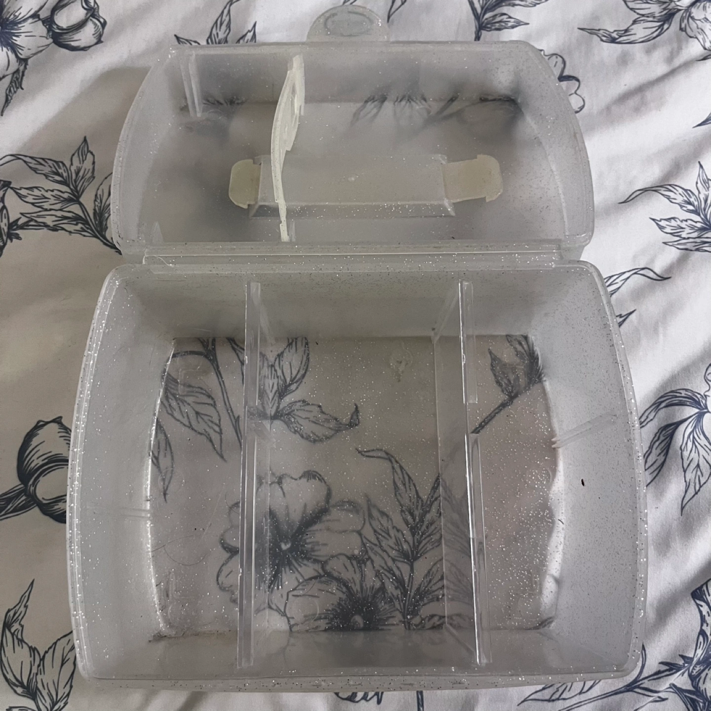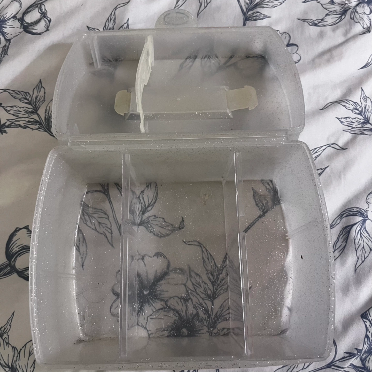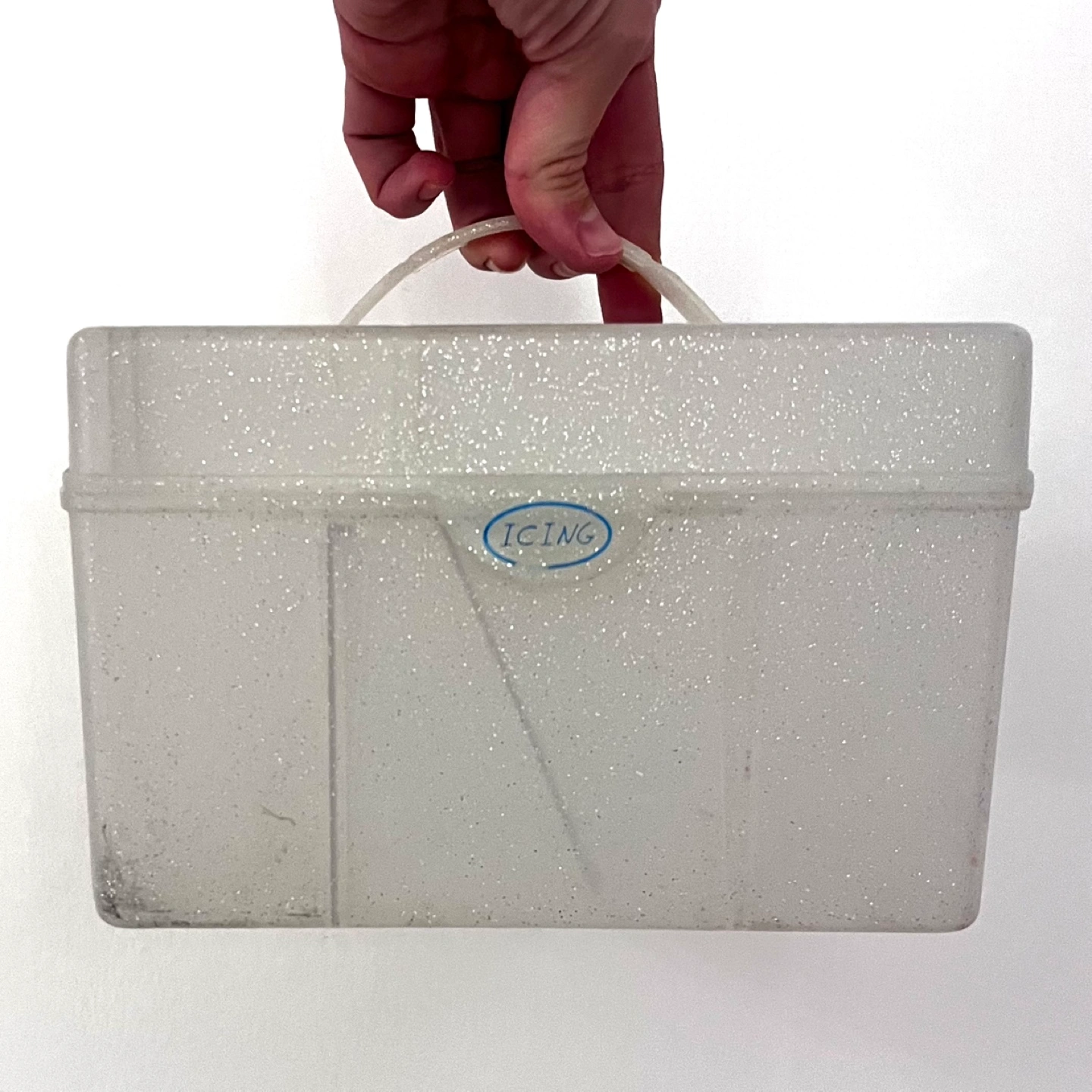 This makeup case is a 2003 Icing relic pre-Claire’s rebrand, complete with a traditional y2k glitter cover. The different inserts can be moved to different shapes. There are holders for brushes up top but it appears to be missing one. It measures at 8.5”x6”x5”. Item is as is but will be cleaned prior to purchase.