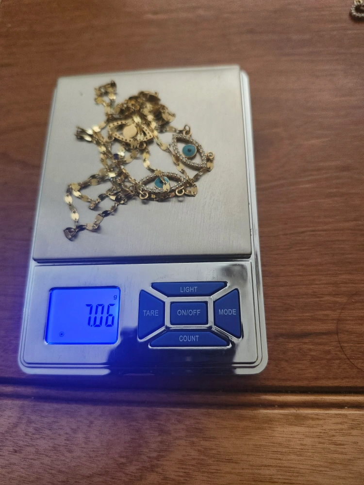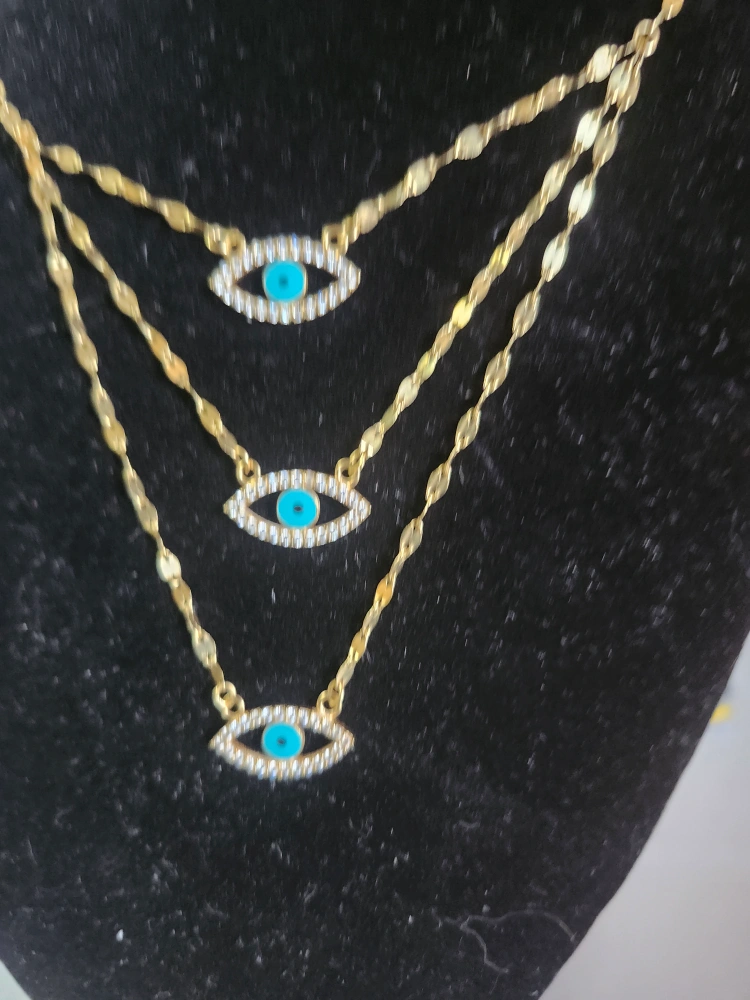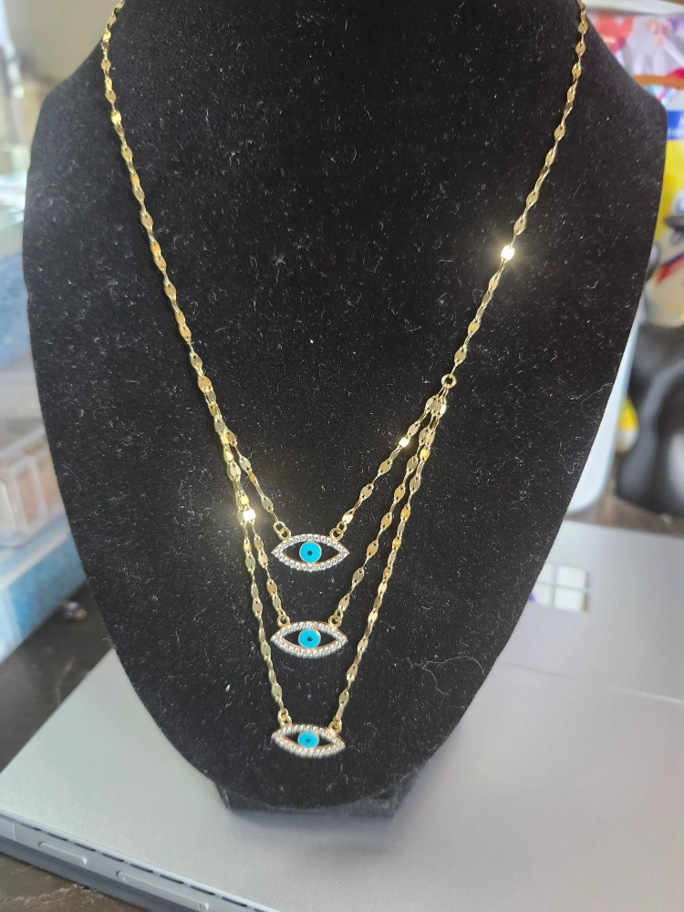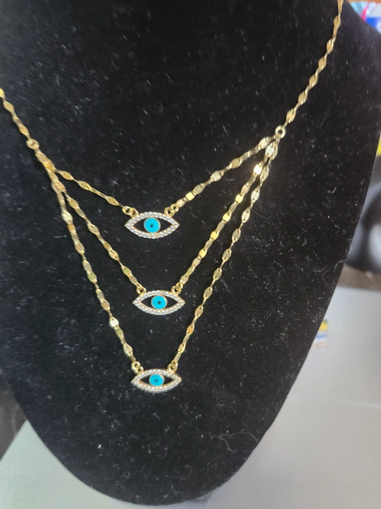 18k Gold Gorgeous layered necklace. Features three evil eye pendants. Gold chain. Turquoise accents. Lightweight.