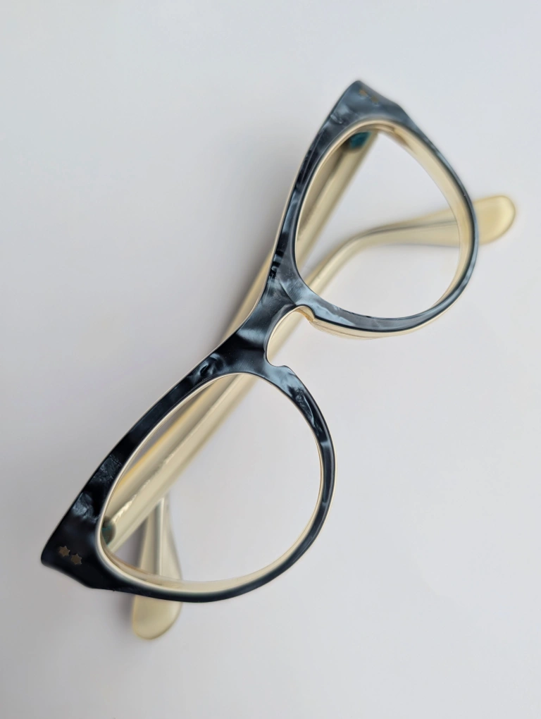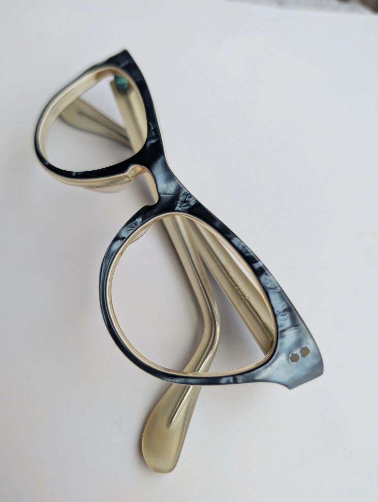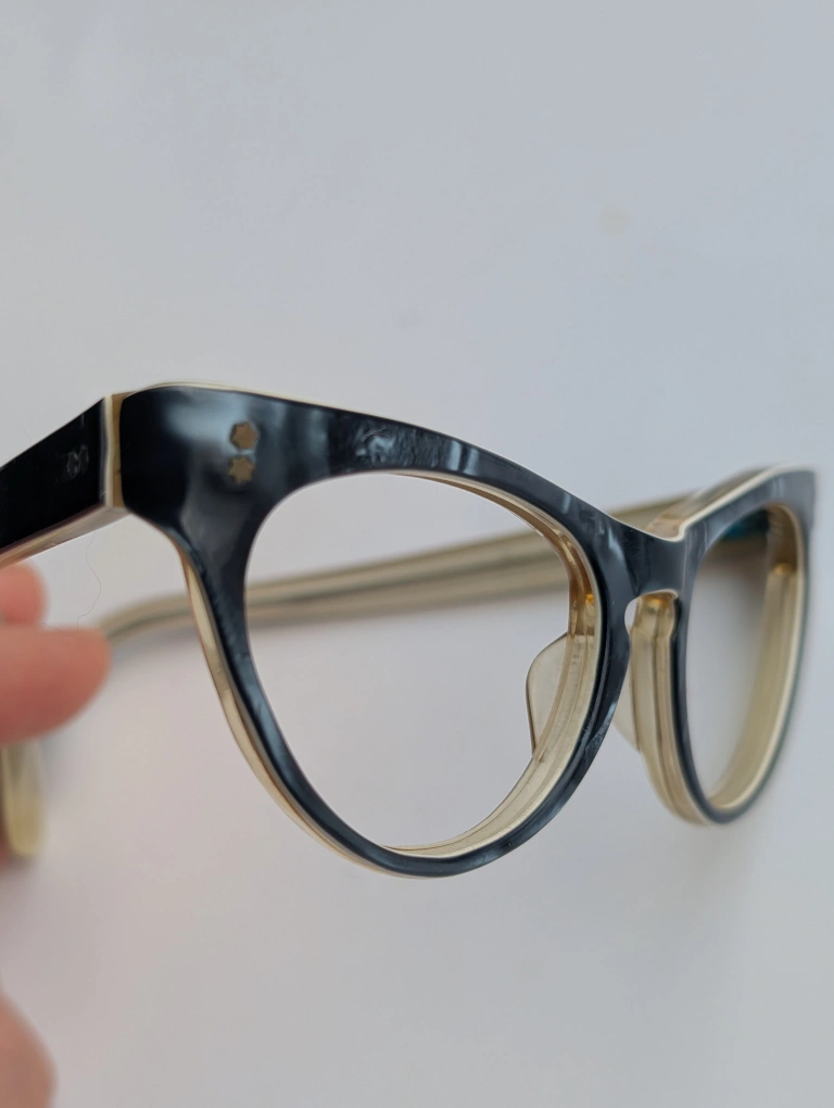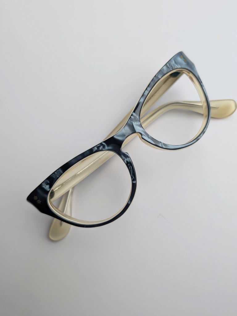 ** These are vintage prescription glasses - frames only. They may need adjustments if you decide to wear SOLD AS IS with flaws ** hinges need to be replaced We are not responsible if glasses are damaged whilst removing, adding lenses, any repairs, modifications etc. Please see description and photos and/or feel free to message with any questions, more pics or measurements. ** Stunning vintage eyeglasses from the 50's - 60's era Good condition despite being decades old These are stunning and unique. They are black pearl finish with cream border and good condition and not worn. I don't see any scratches or dents etc. There is substantial oxidization on hinges and there are hard to open because of stiffness. Purchased from an optometrists' shop that went out of business decades ago. New old stock and WITHOUT lenses. ** Item sold AS IS with flaws ** Not extra small size like some vintage glasses, but lense frames are narrow and very cats eye like! No lenses