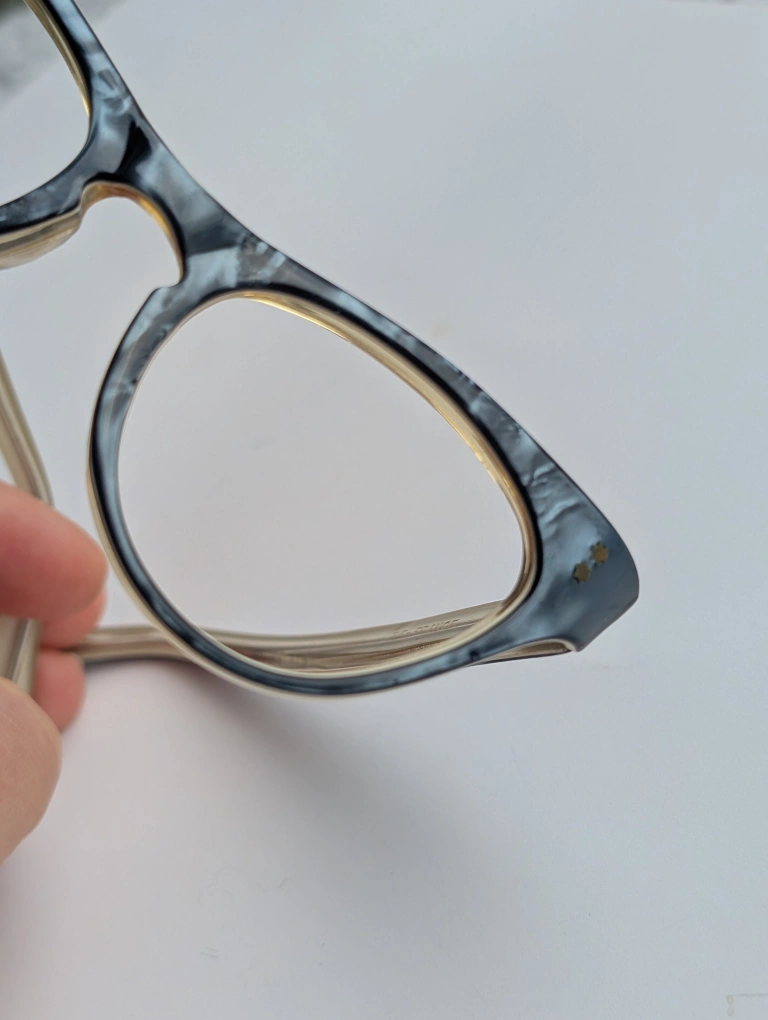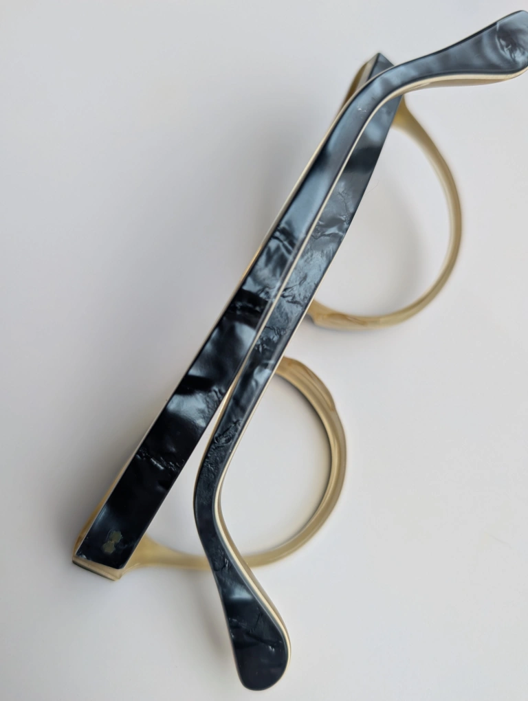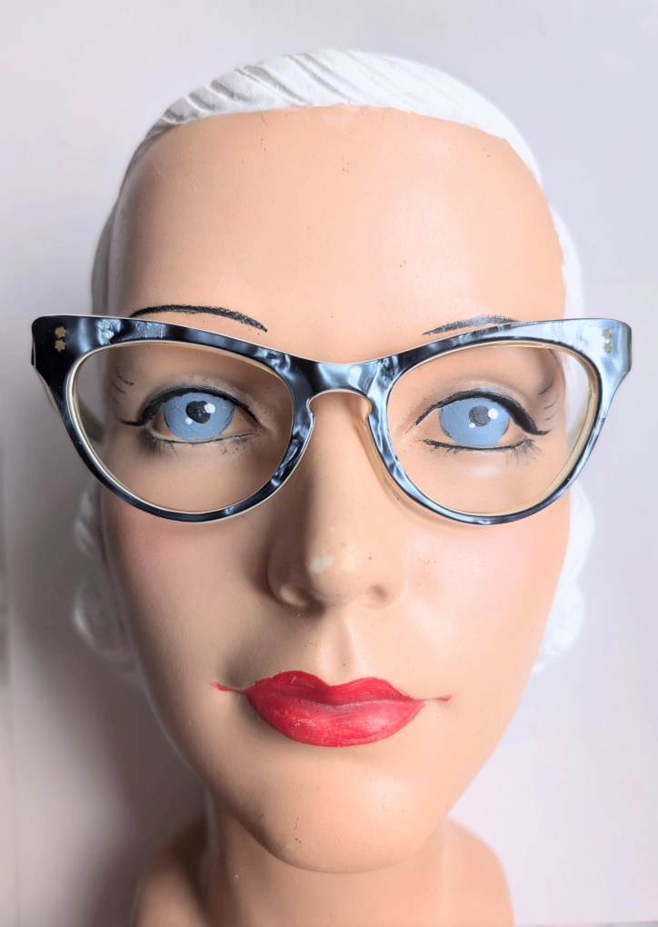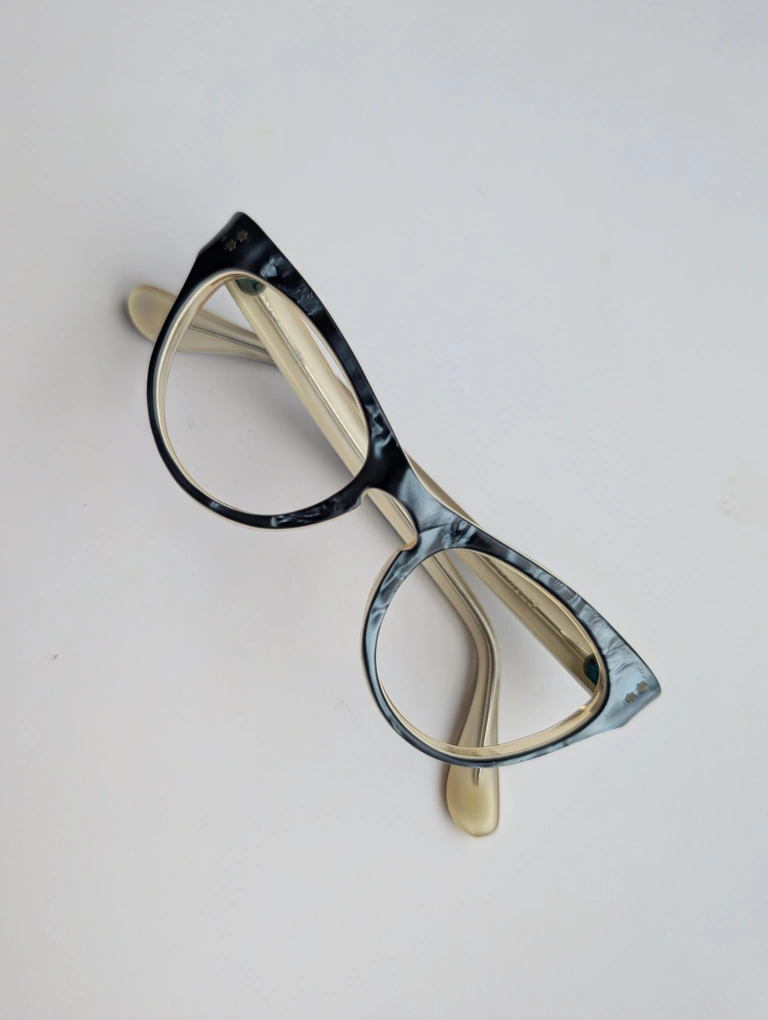 ** These are vintage prescription glasses - frames only. They may need adjustments if you decide to wear SOLD AS IS with flaws ** hinges need to be replaced We are not responsible if glasses are damaged whilst removing, adding lenses, any repairs, modifications etc. Please see description and photos and/or feel free to message with any questions, more pics or measurements. ** Stunning vintage eyeglasses from the 50's - 60's era Good condition despite being decades old These are stunning and unique. They are black pearl finish with cream border and good condition and not worn. I don't see any scratches or dents etc. There is substantial oxidization on hinges and there are hard to open because of stiffness. Purchased from an optometrists' shop that went out of business decades ago. New old stock and WITHOUT lenses. ** Item sold AS IS with flaws ** Not extra small size like some vintage glasses, but lense frames are narrow and very cats eye like! No lenses