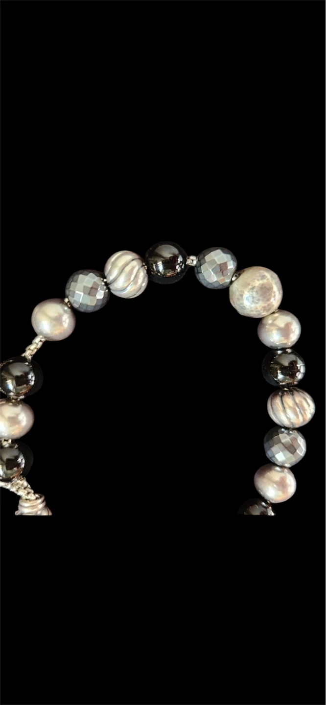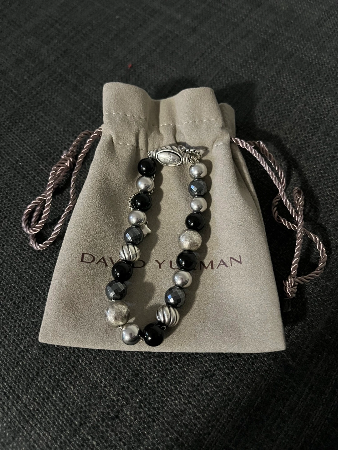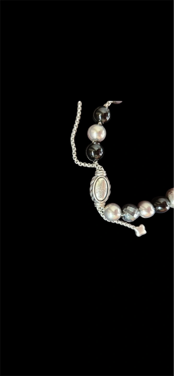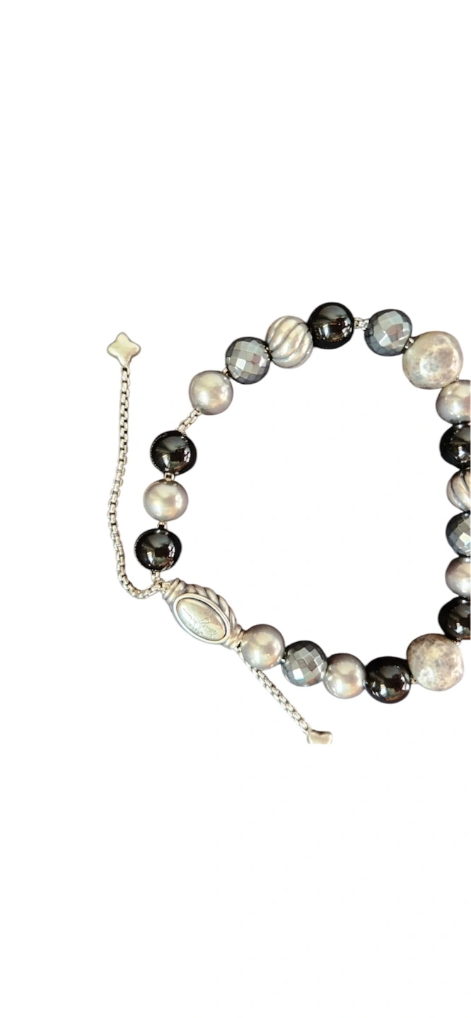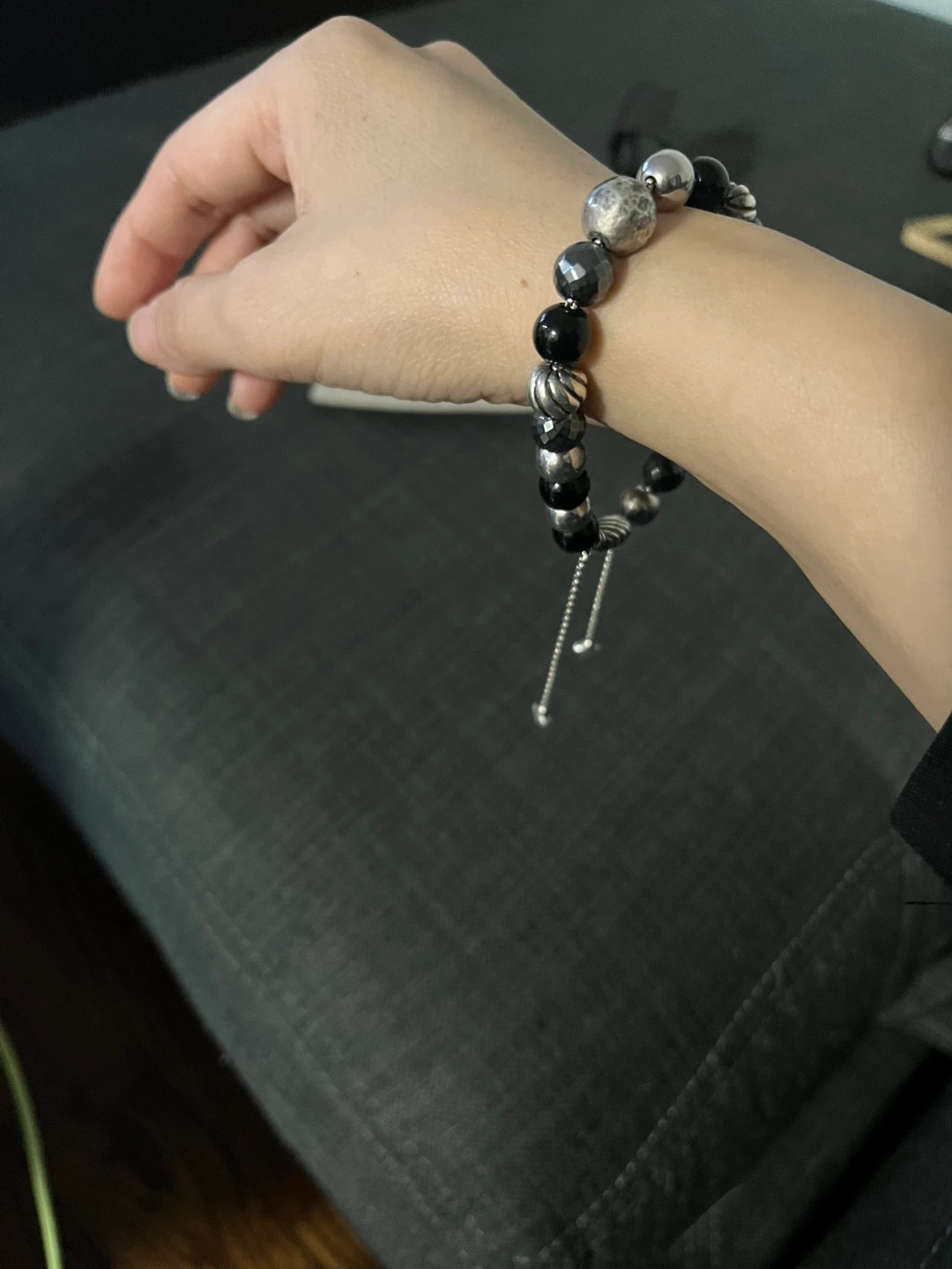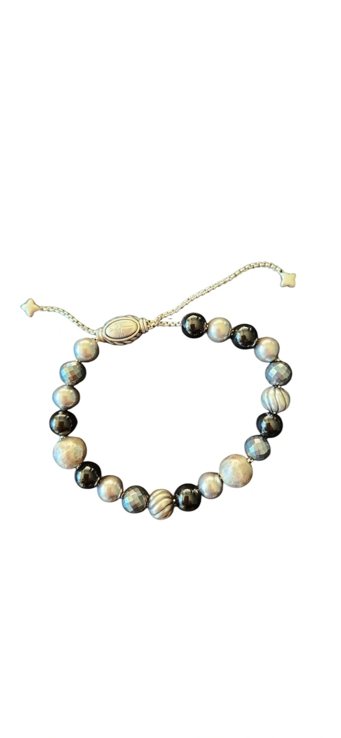 Silver and black beaded bracelet. Features various stones and an adjustable clasp. Comes with pouch.