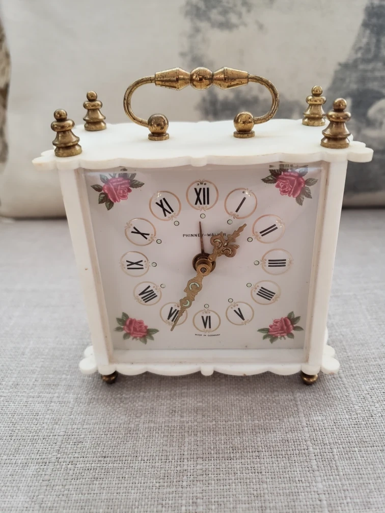 Small vintage alarm clock. White plastic case, gold coloured accents. Roman numerals and rose detailing. Made in Germany.