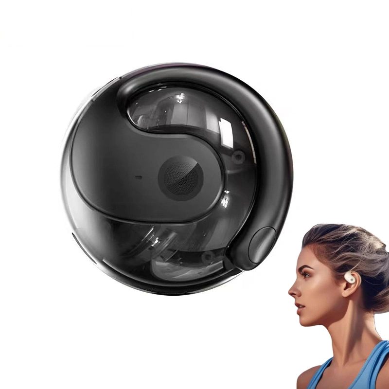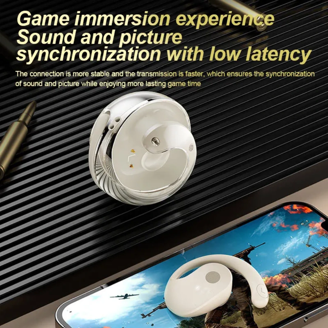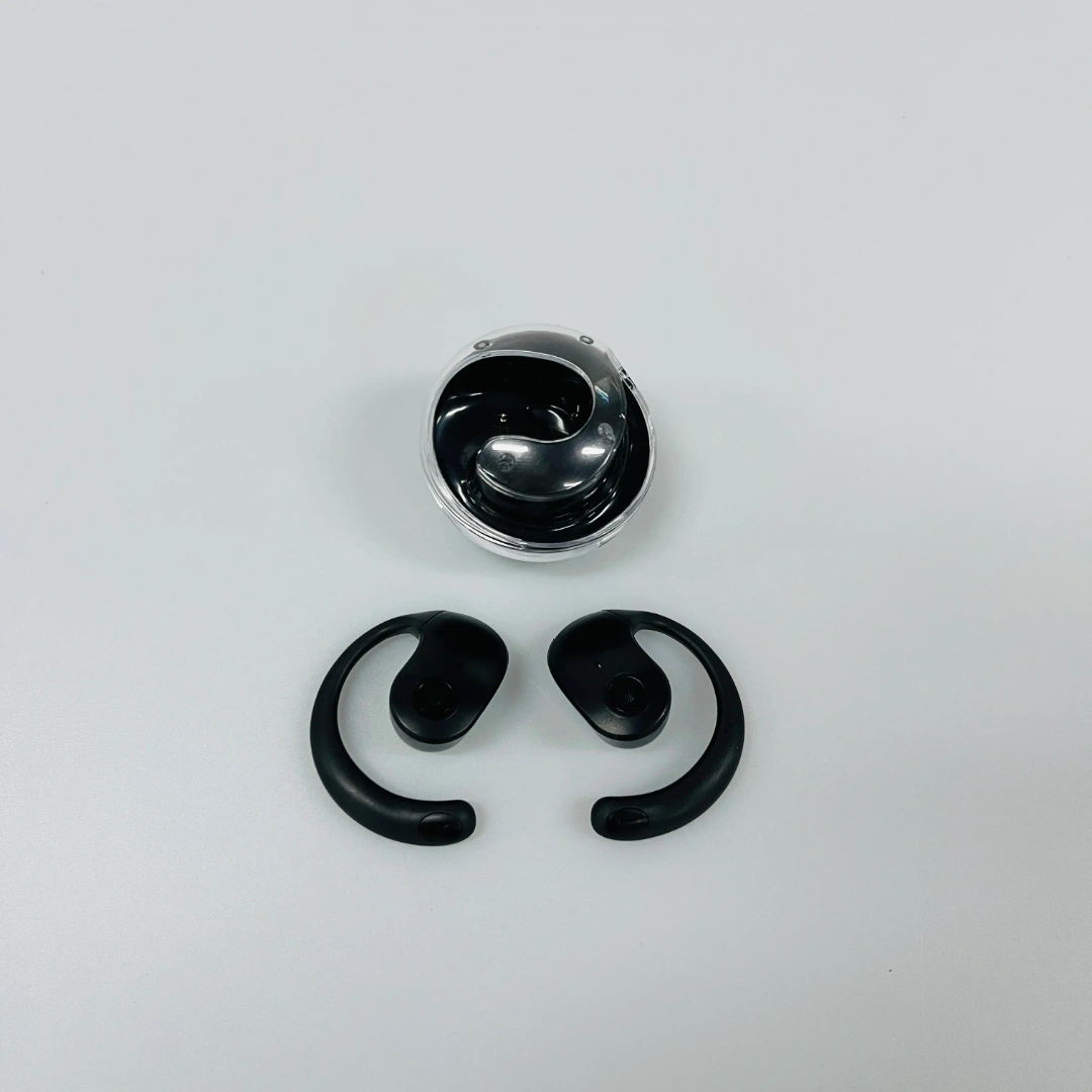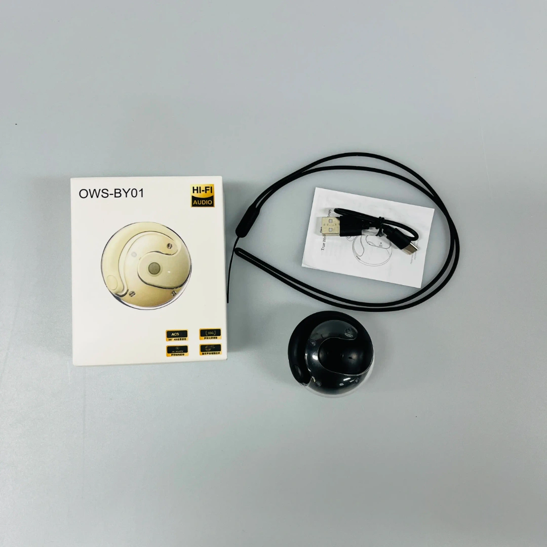 Hi-Fi audio bone conduction earbuds. Includes charging case and extra ear hooks. Low latency for gaming. Model OWS-BY01.