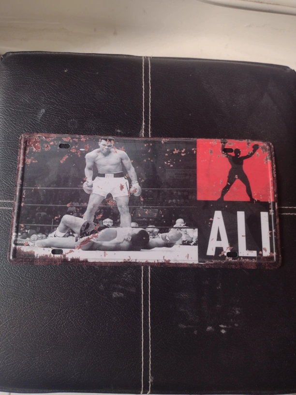 Collectible metal plate. Features Muhammad Ali image. Shows signs of wear. Great for collectors or fans.