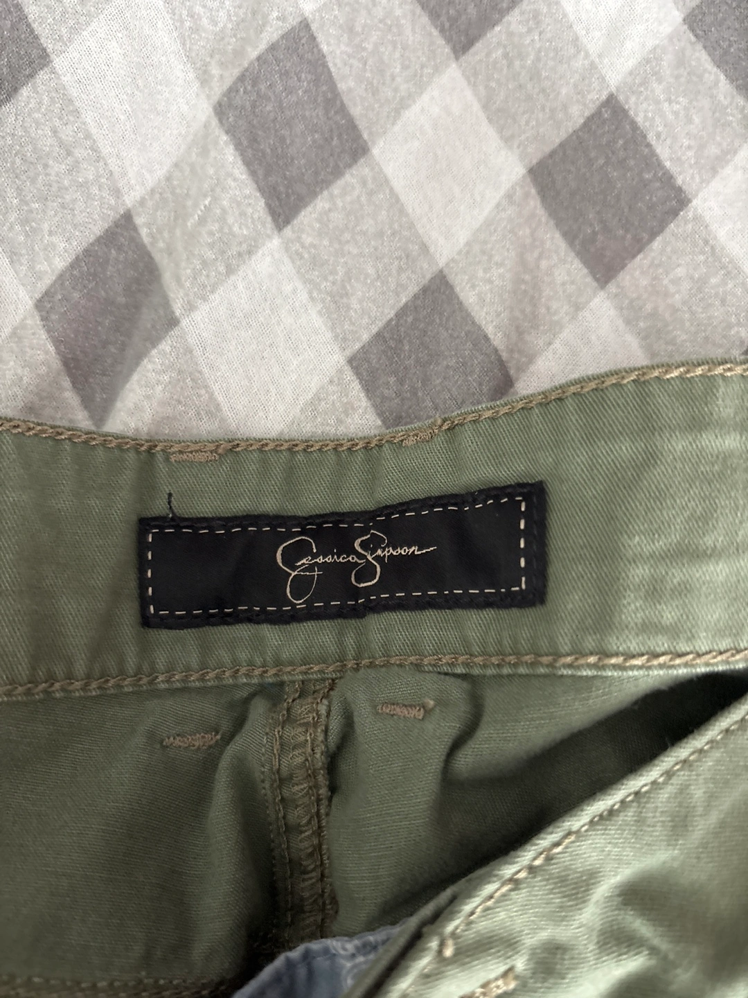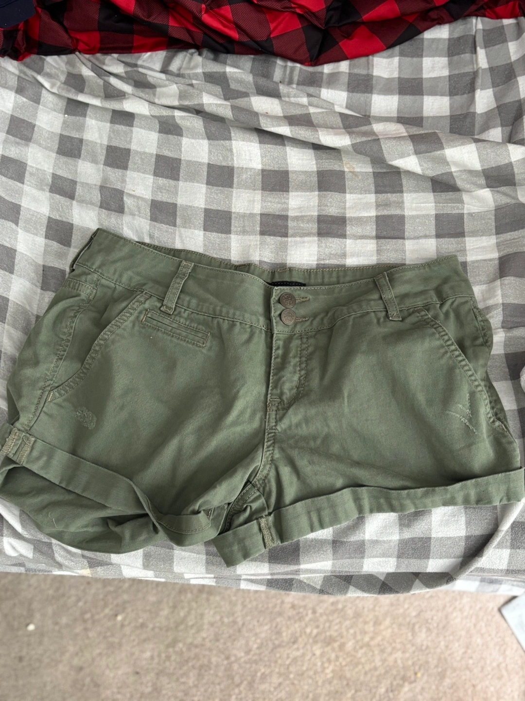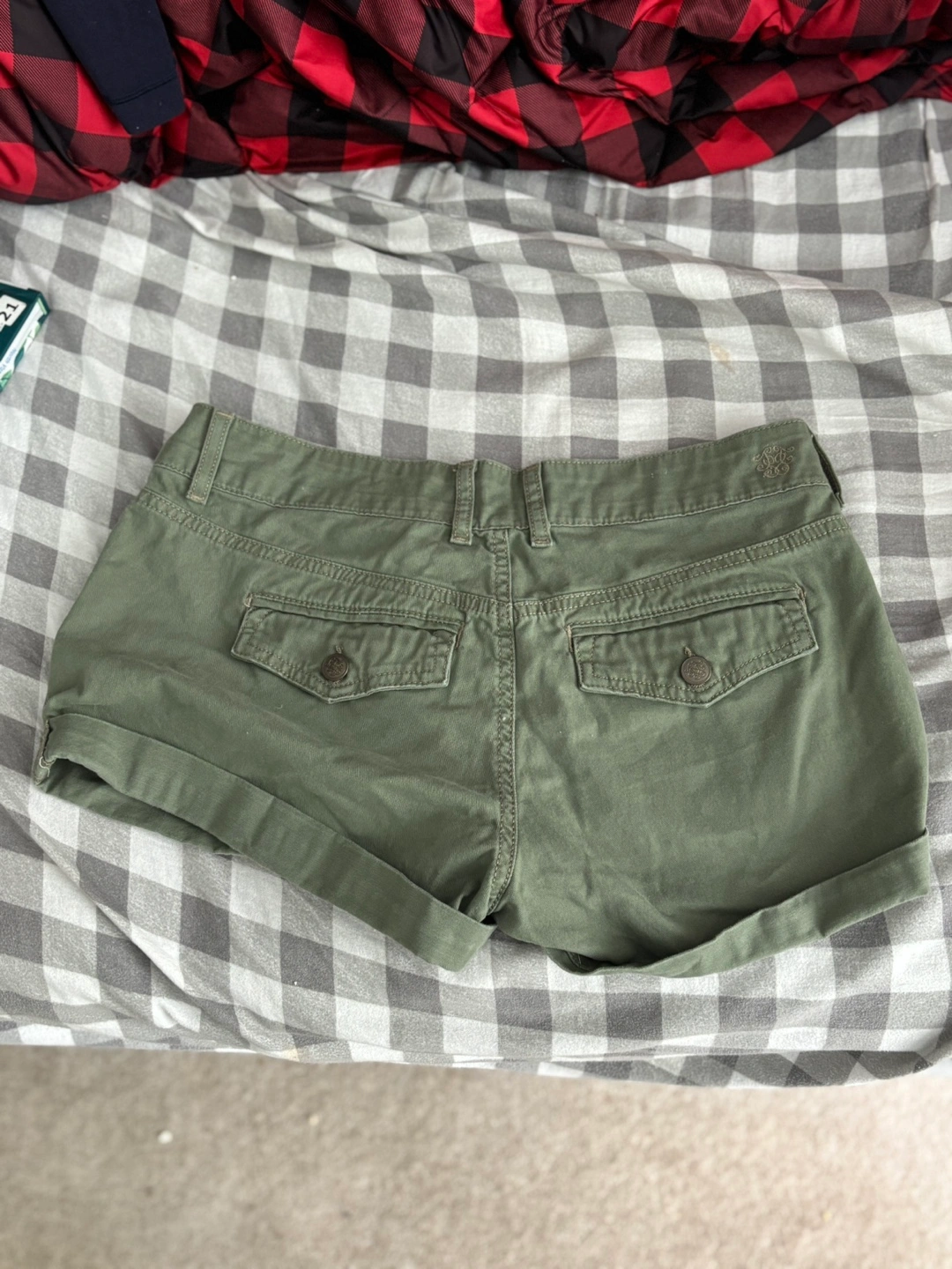 Olive green shorts. Rolled cuffs. Two front pockets. Two buttoned back pockets. Button and zip closure.