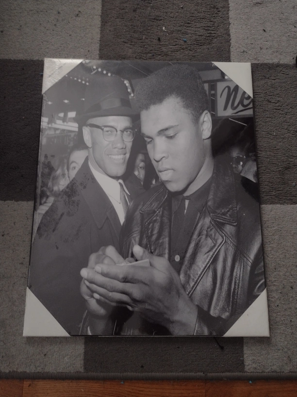 Large framed black and white photo print. Features Muhammad Ali and Malcolm X. Great for collectors. Slight corner damage to the frame.
