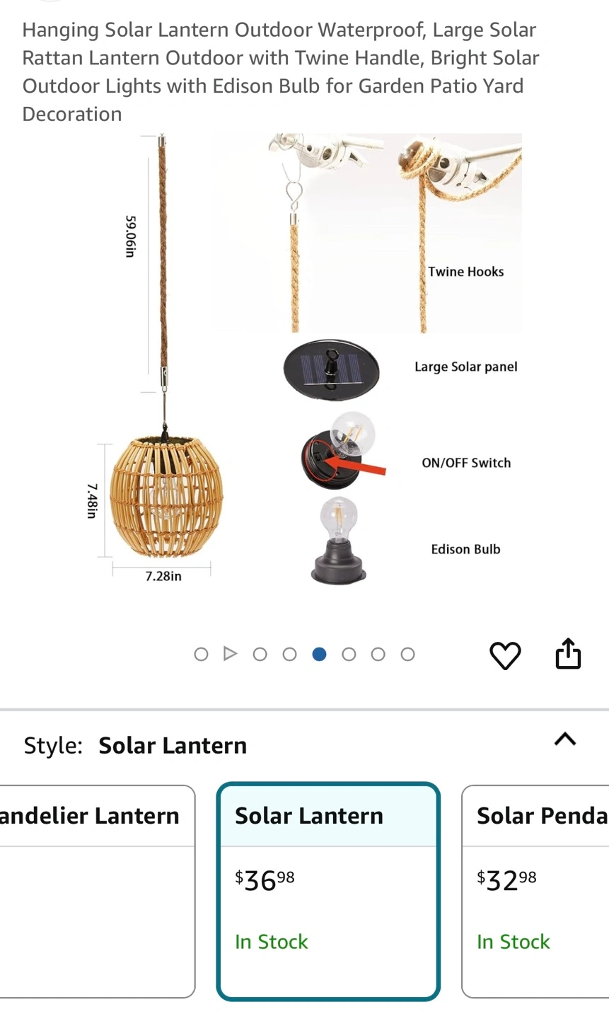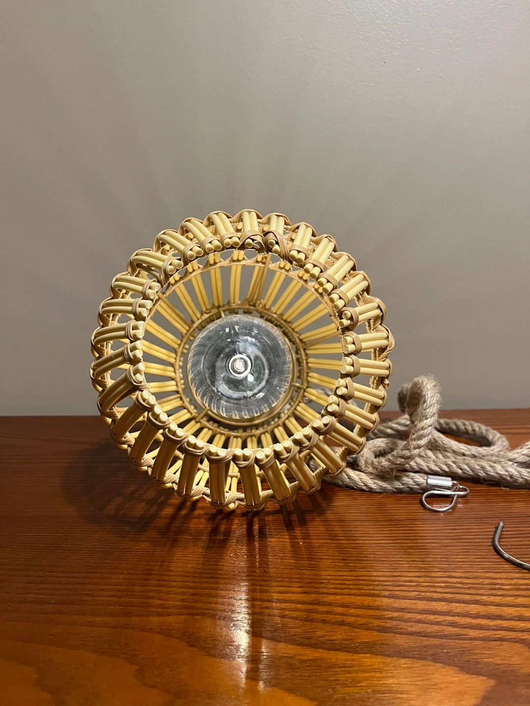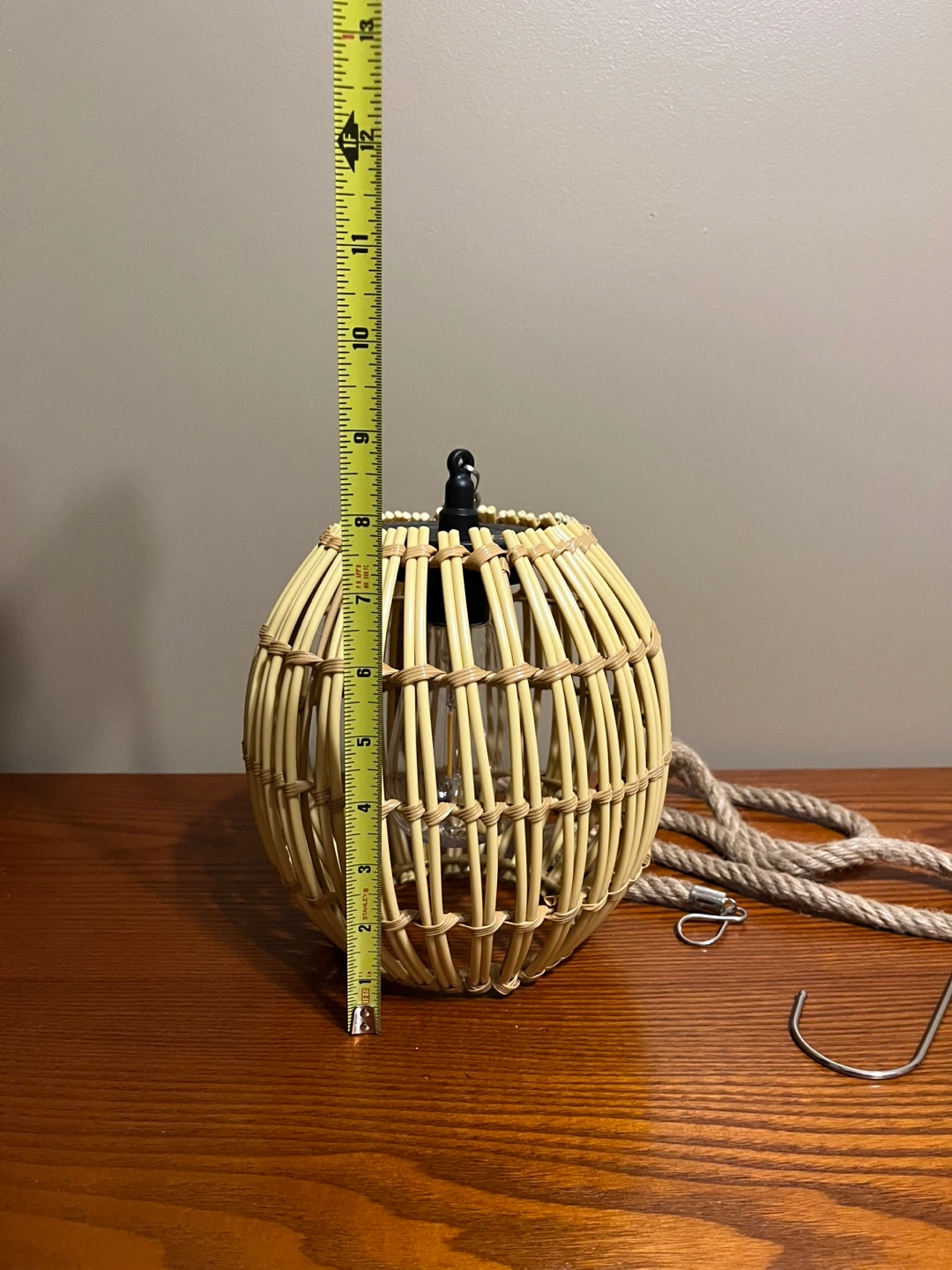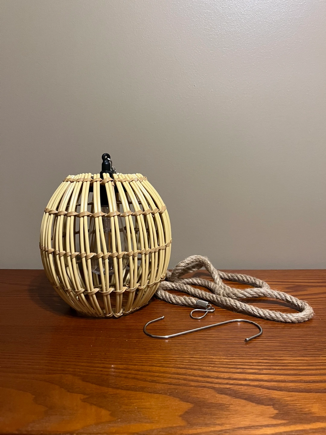 BRAND NEW (Never used) Decorative Rattan solar lantern. Made with natural bamboo and plastic rattan with twine hooks and a retro Edison bulb. Measurements and information are shown in the pictures. Last picture is for price reference only. Cross posted.