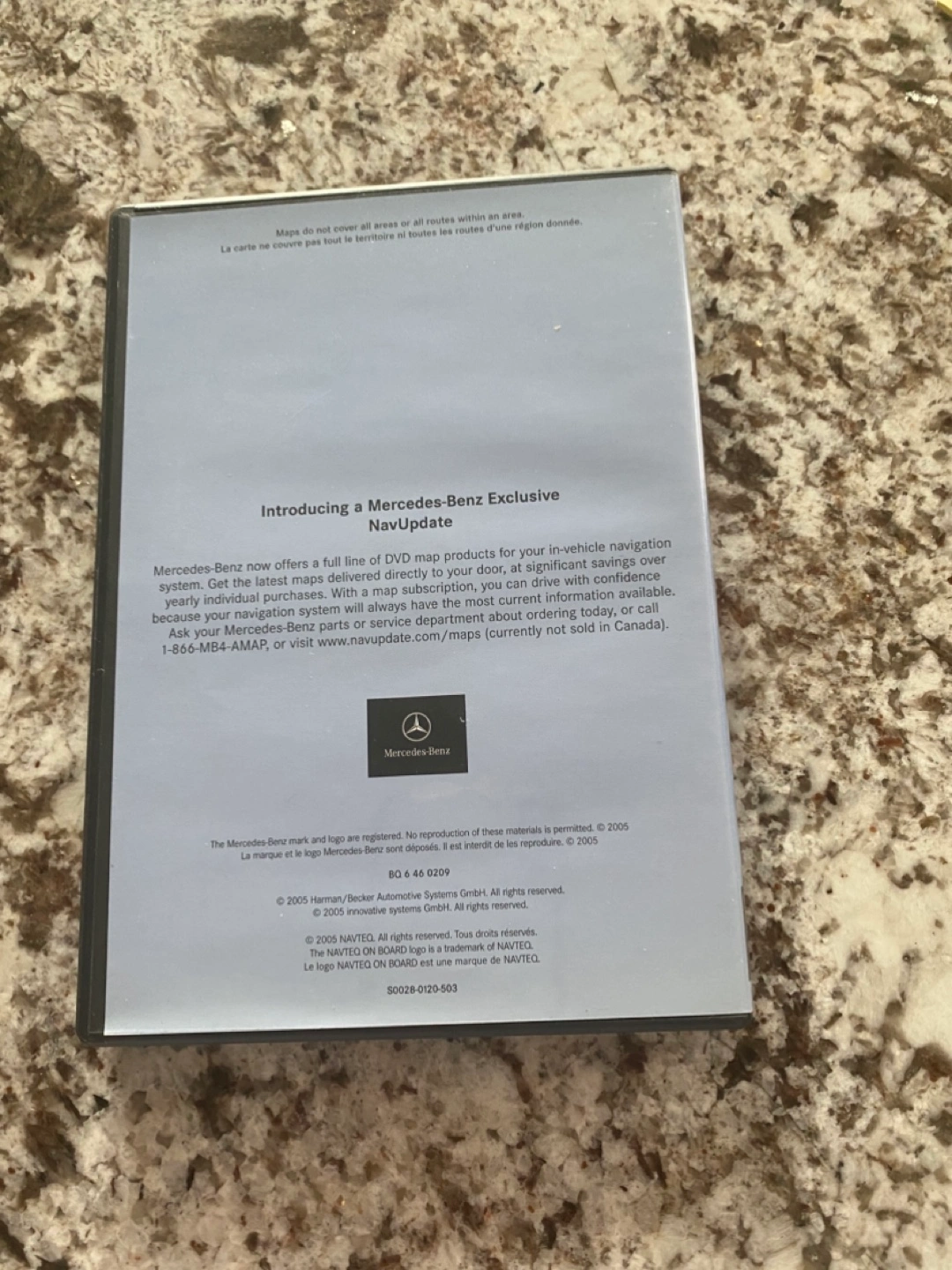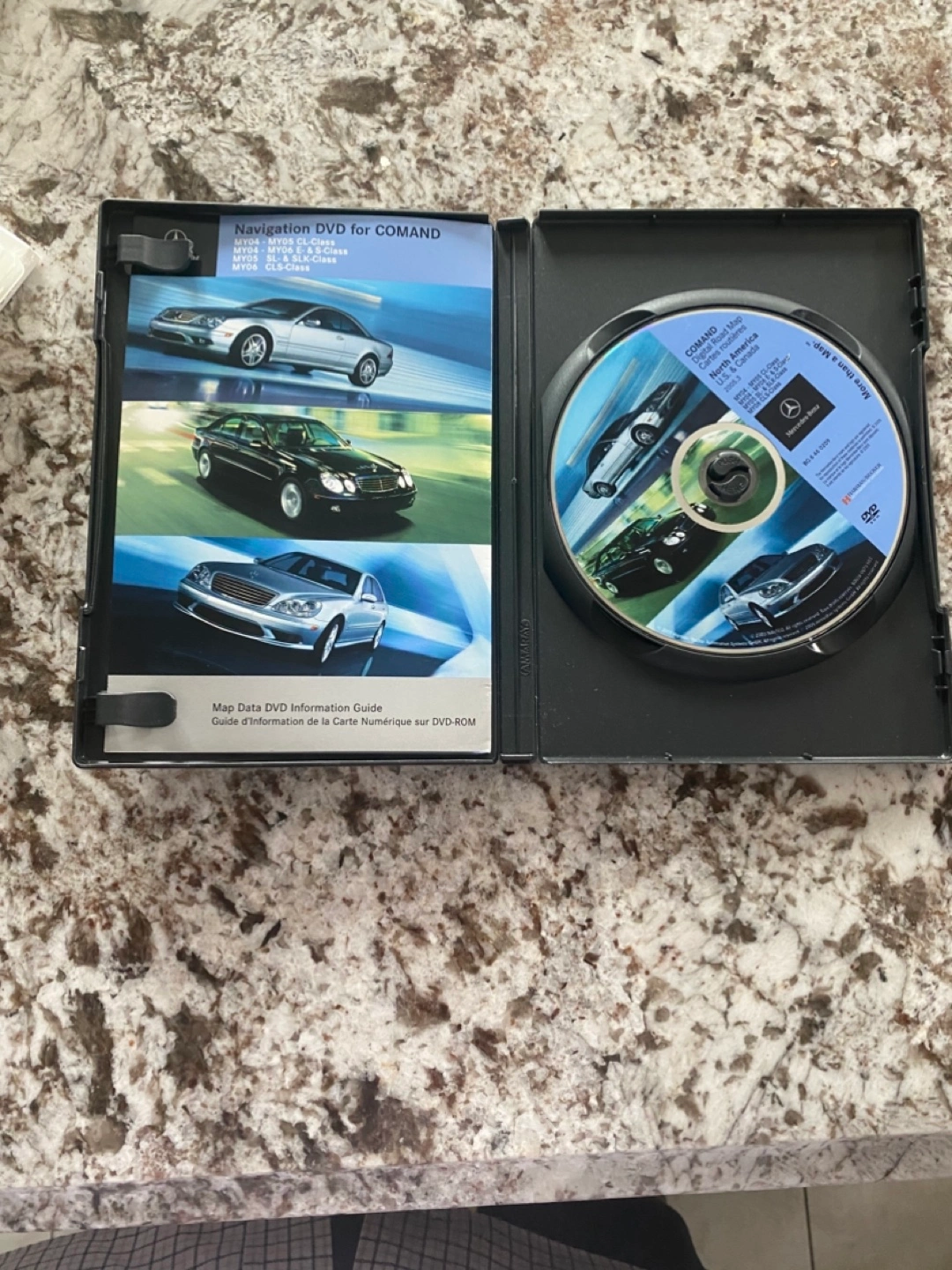 Navigation DVD for Mercedes-Benz COMMAND system. Covers United States and Canada. Includes map data and information guide. For MY04-MY06 CL-Class, S-Class, SL-Class, and CLS-Class models. Pre-owned.
