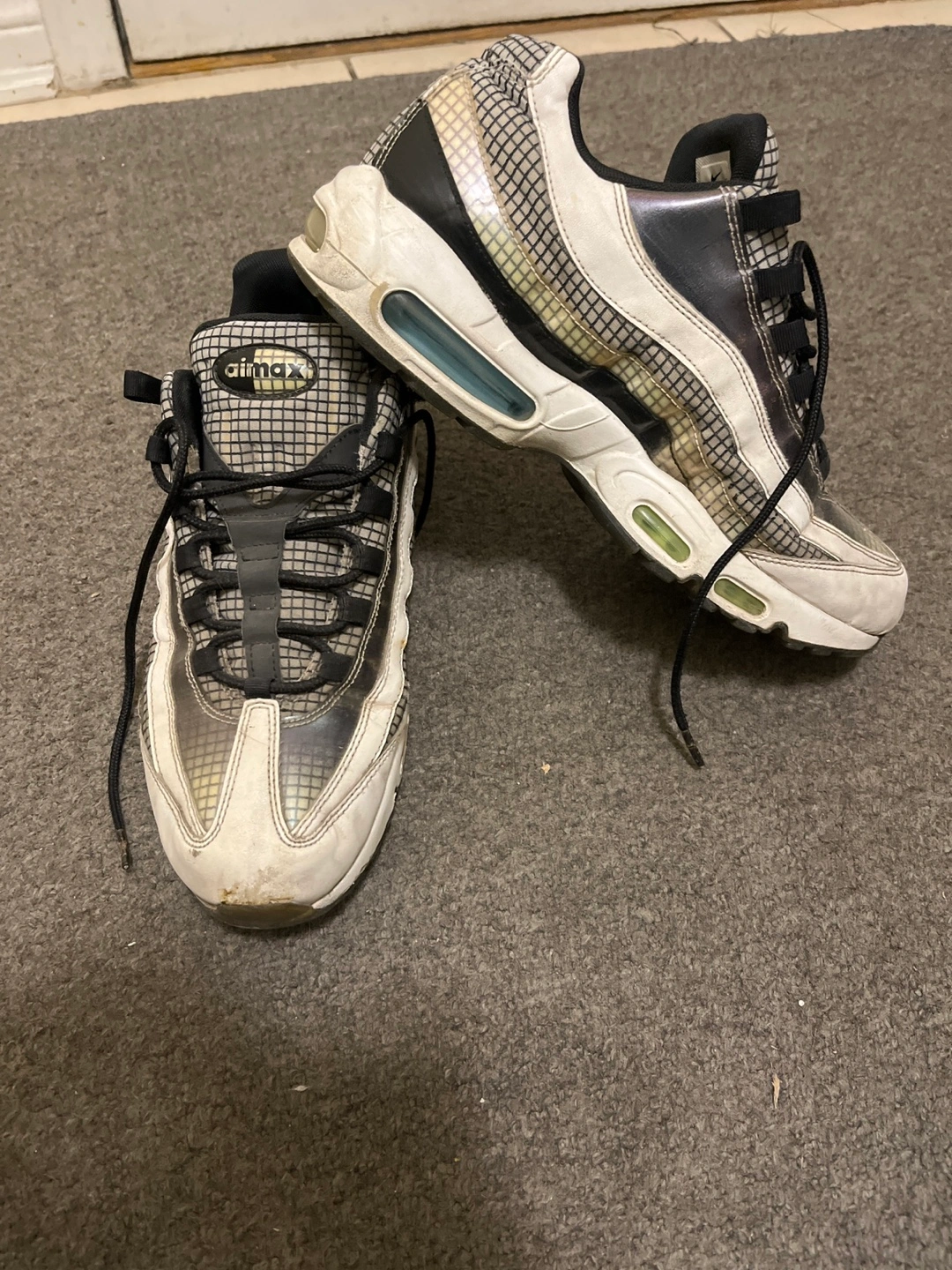 Needs some love and cleaning ,Pre-owned Nike Air Max 95 running shoes. Black and white colour scheme. Unique grid pattern design. Visible Air cushioning in the heel. Lace-up closure. Soles need to be added, Some wear and tear.
