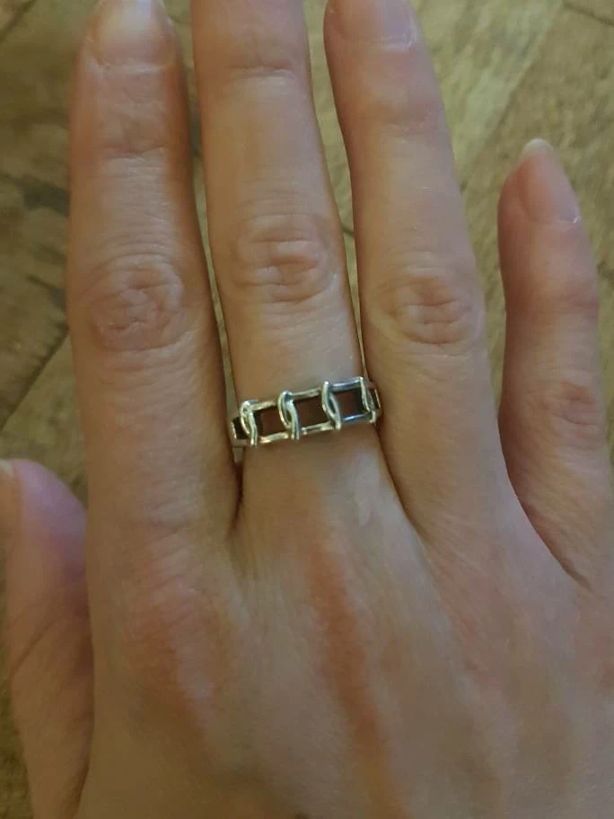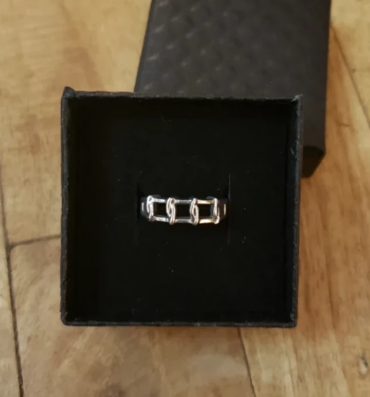 Unique, handcrafted 925 sterling silver ring. Features a raised, link design. Comes in a black gift box.