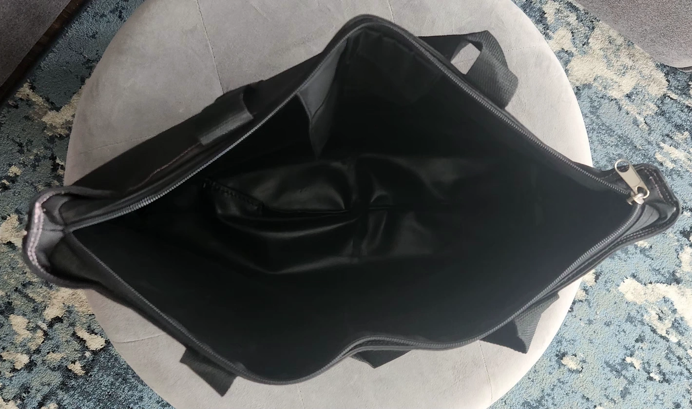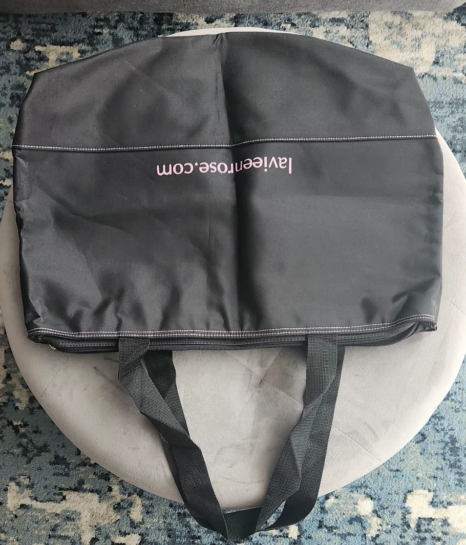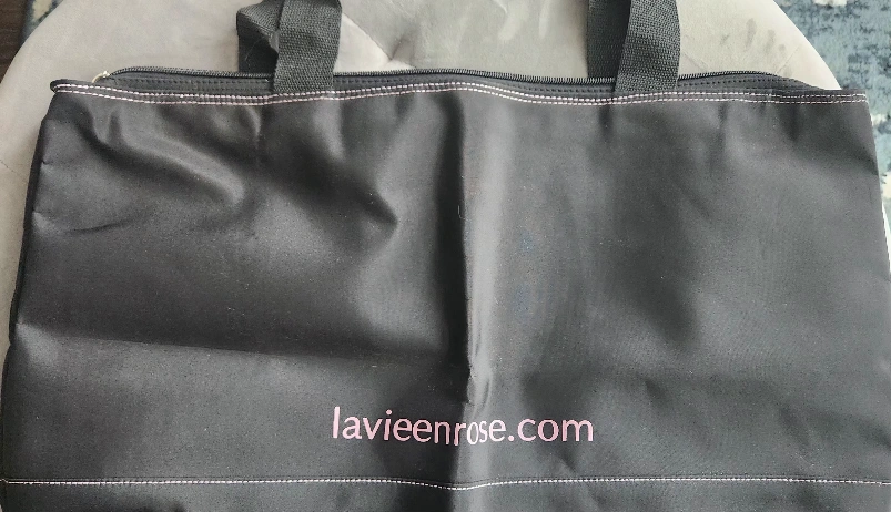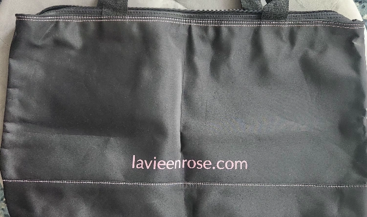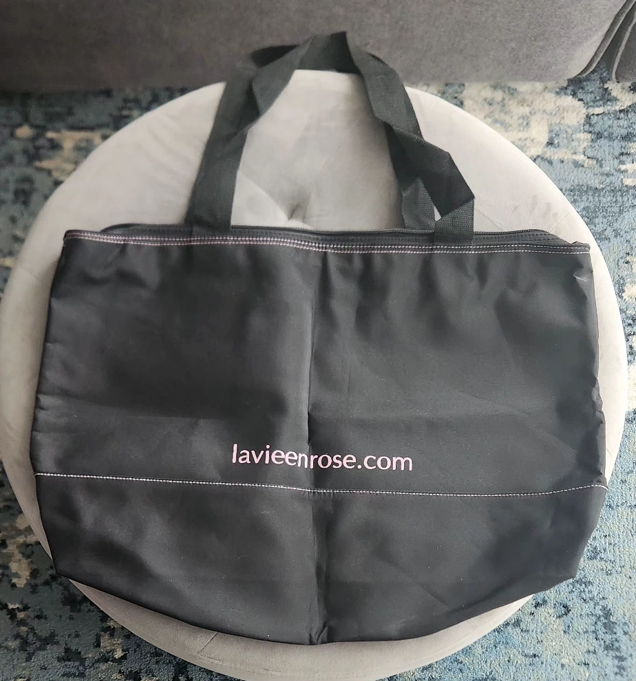 La Vie En Rose black tote bag with two handles. Fabric repels water and is easily cleaned. Features a zipper closure and accented with pink writing and stitching. Lays flat when not in use. Measures 13" tall x 22" long x 4.5" wide. Never been used. *** Also selling a smaller version of this bag for $10 that measures 12" tall x 18" long x 4" wide.