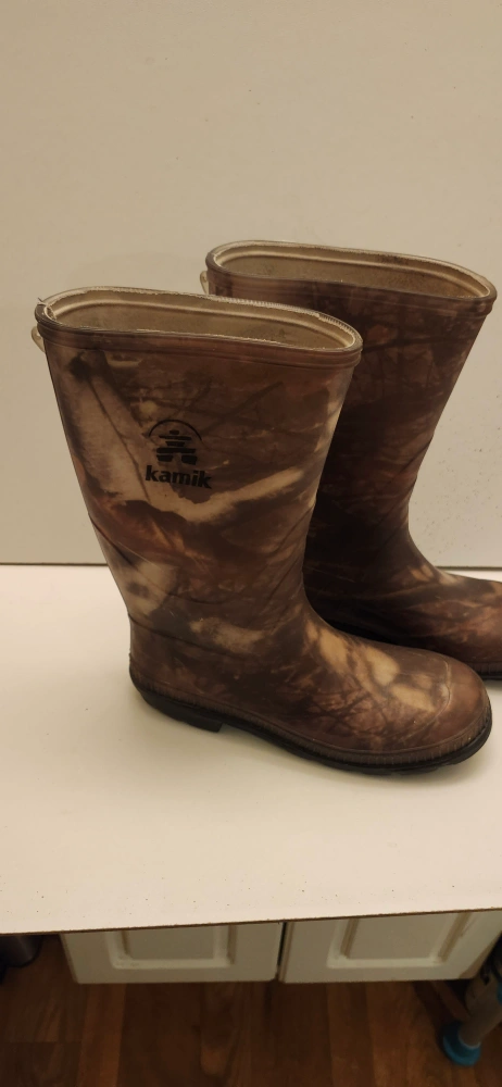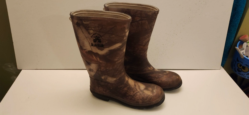 Kids' size rain boots. Camouflage pattern. Good for puddles and rainy days. Pre-owned. meet up on O'Connor drive outside TD bank door East York