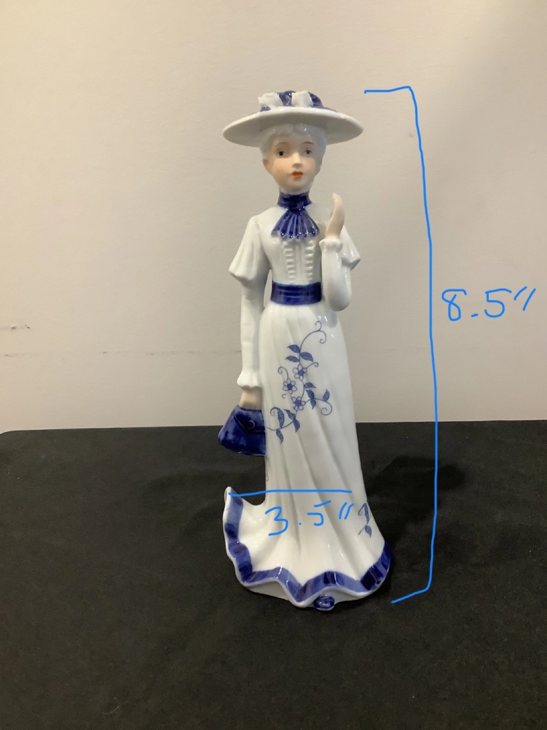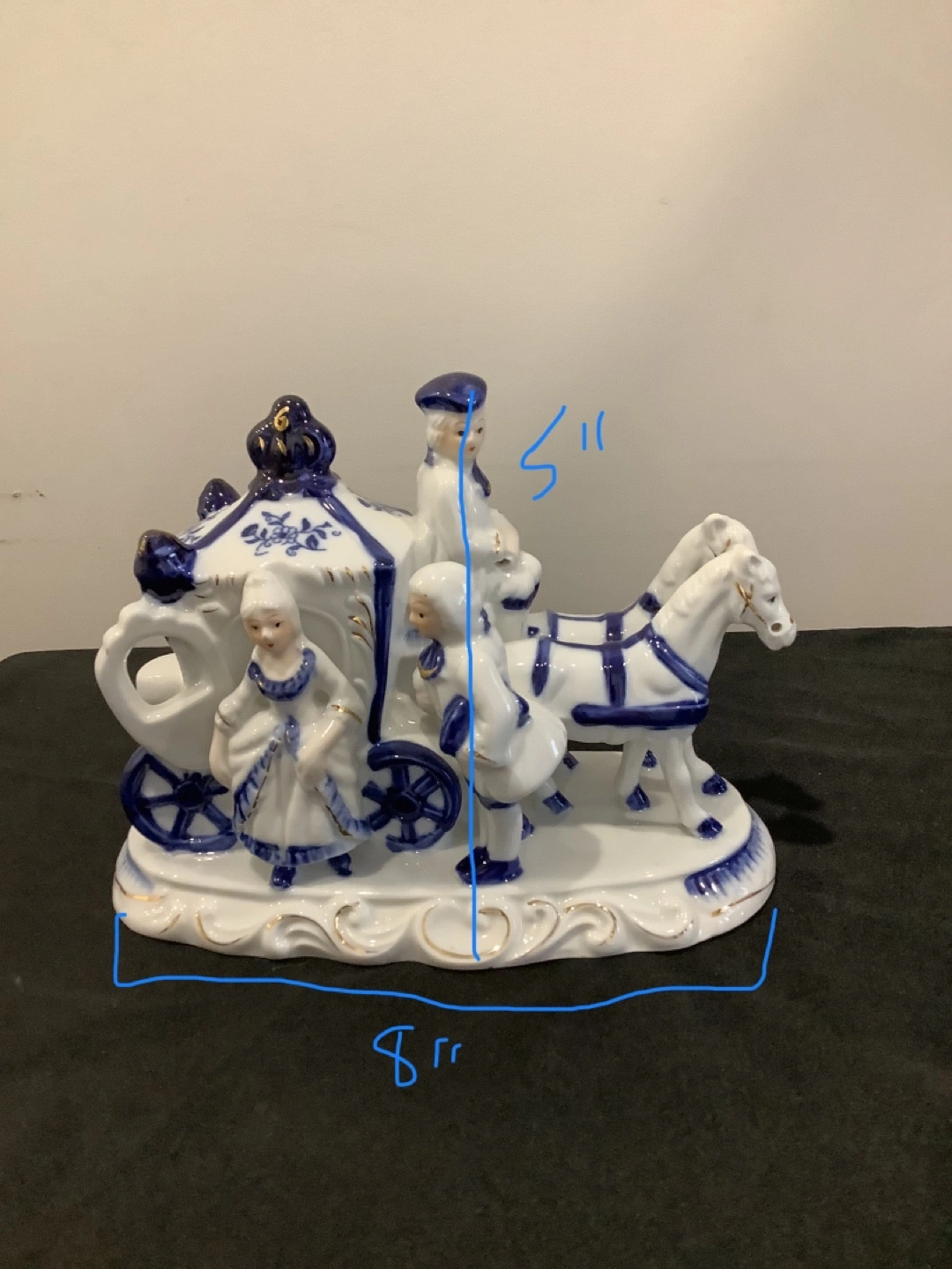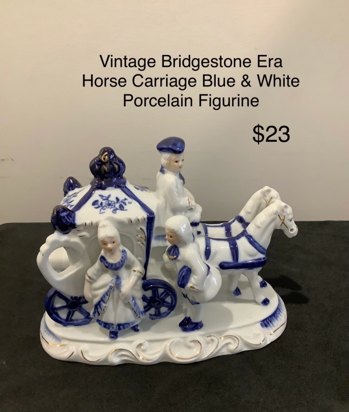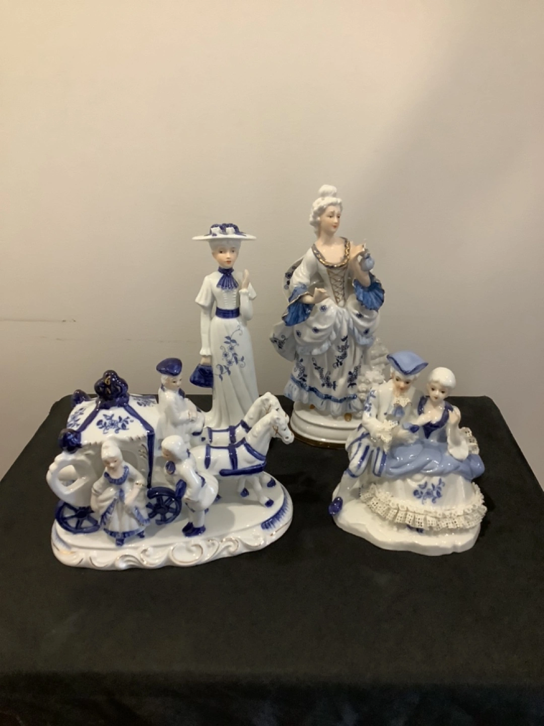 Take all for $40 or individually. Collection of four vintage porcelain figurines. Blue and white colour scheme. Features ladies in period dress and a horse-drawn carriage. Excellent decorative pieces.