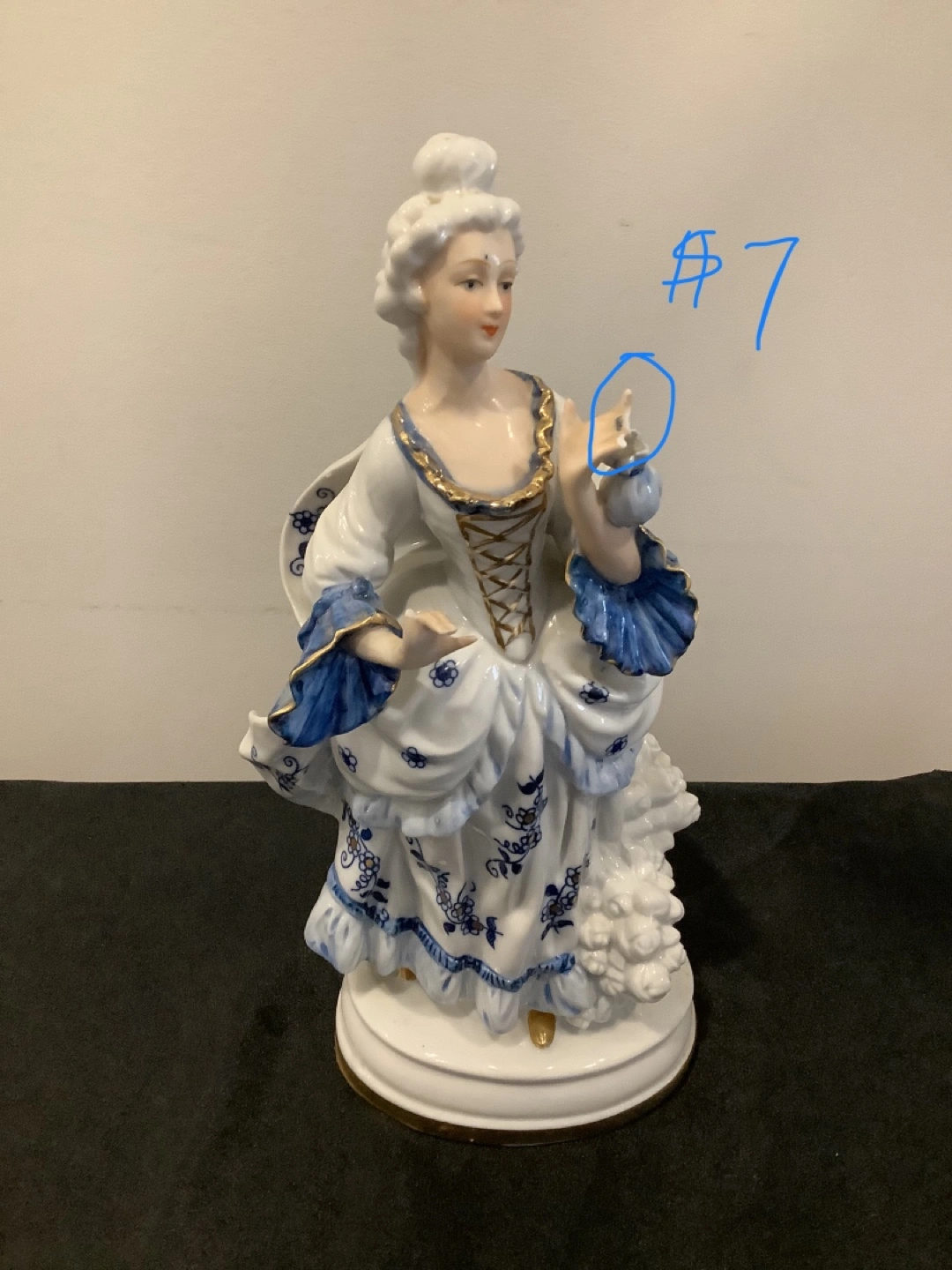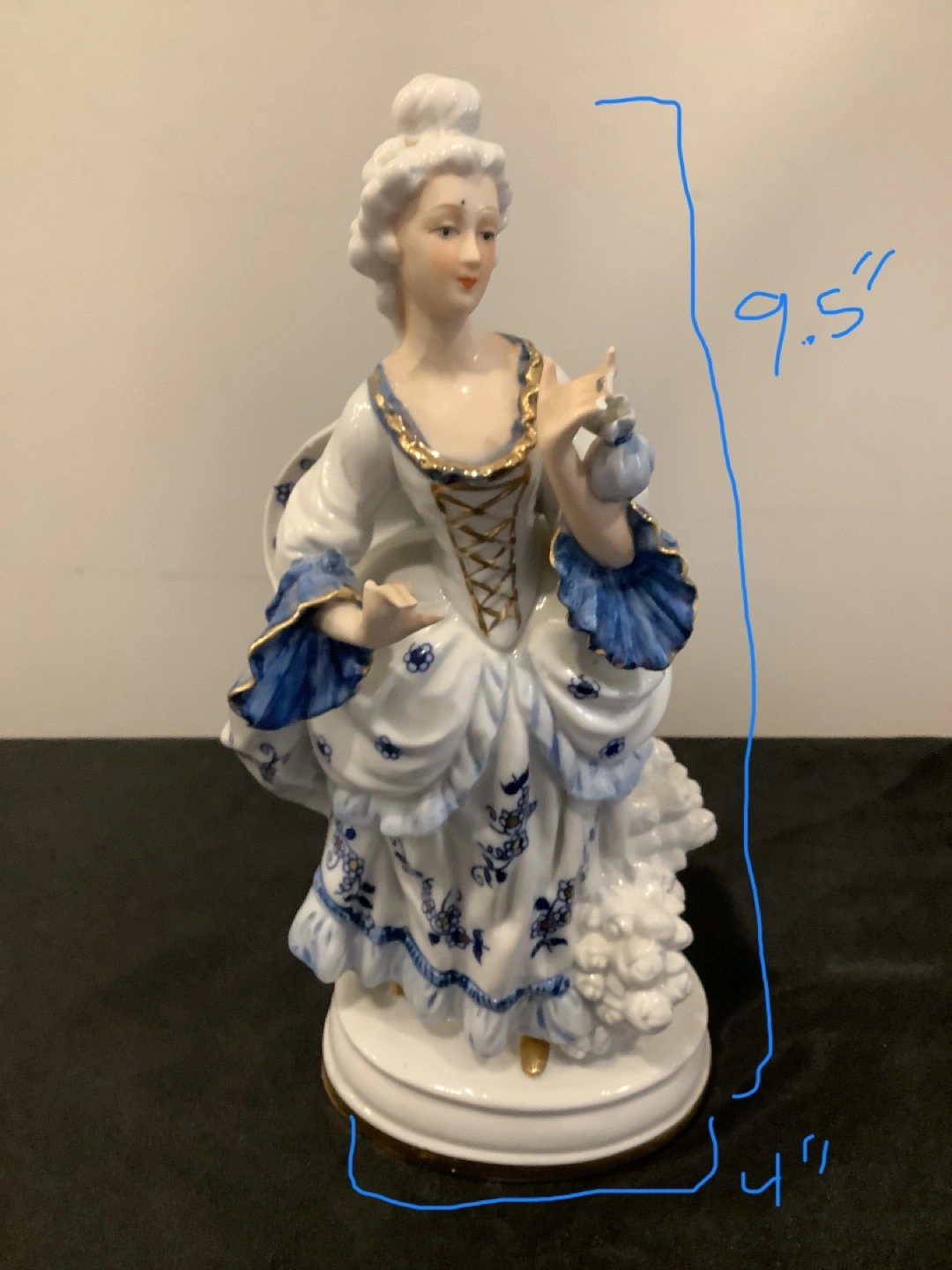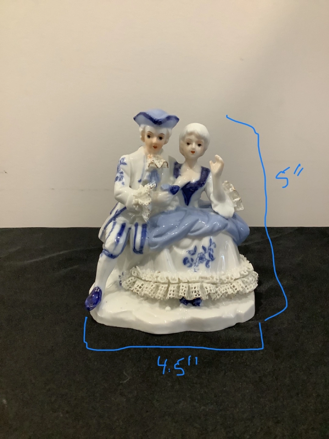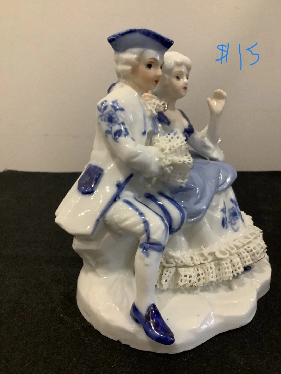 Take all for $40 or individually. Collection of four vintage porcelain figurines. Blue and white colour scheme. Features ladies in period dress and a horse-drawn carriage. Excellent decorative pieces.