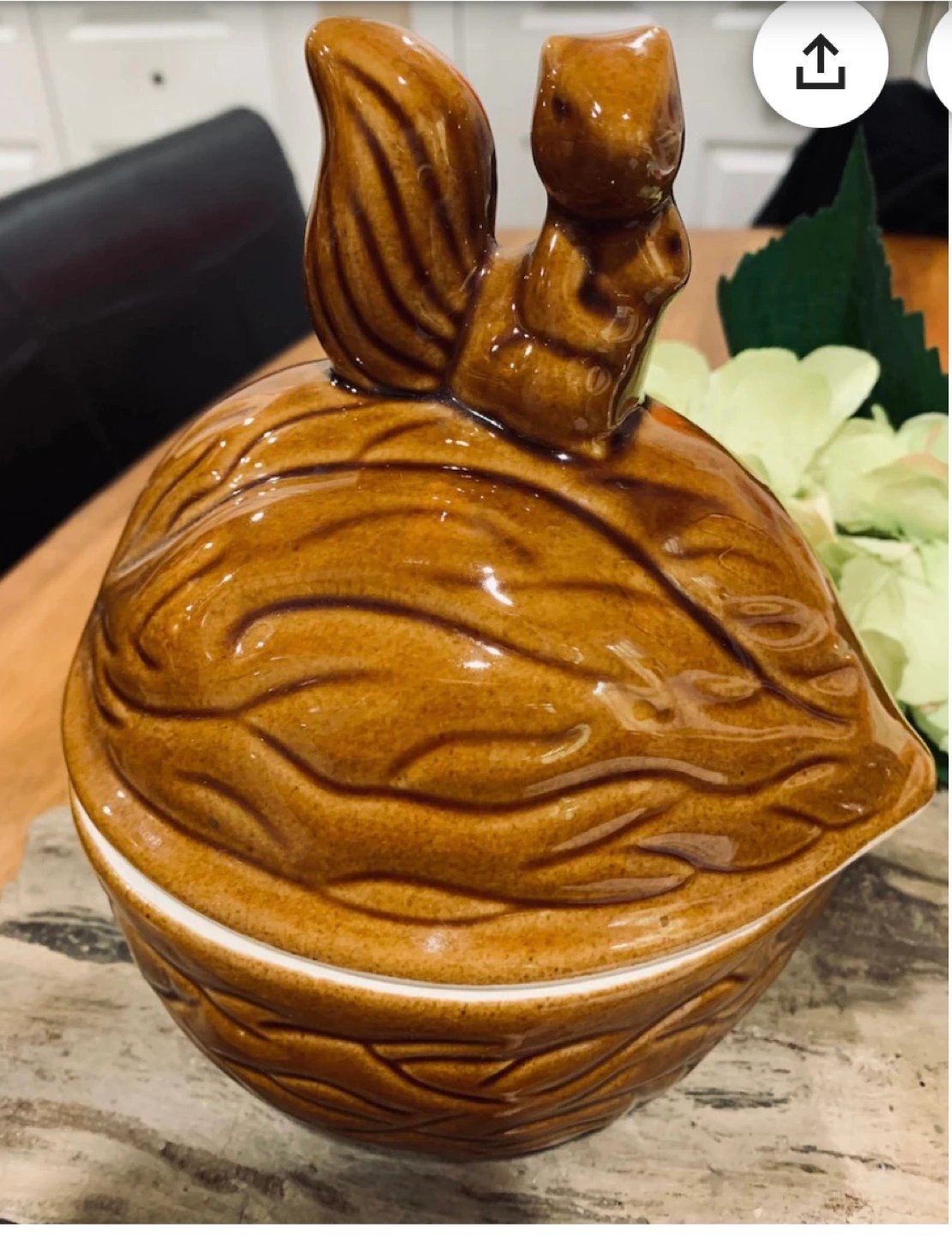 Adorable vintage ceramic candy dish. Shaped like a walnut, featuring a squirrel on top. Perfect for candies, nuts, or trinkets. Brown glaze.