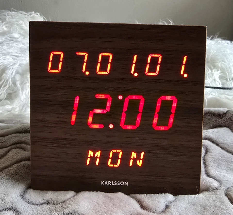 Modern cube-shaped clock. Features a red LED digital display. Shows time, day and date. Wooden casing. Power cord included.