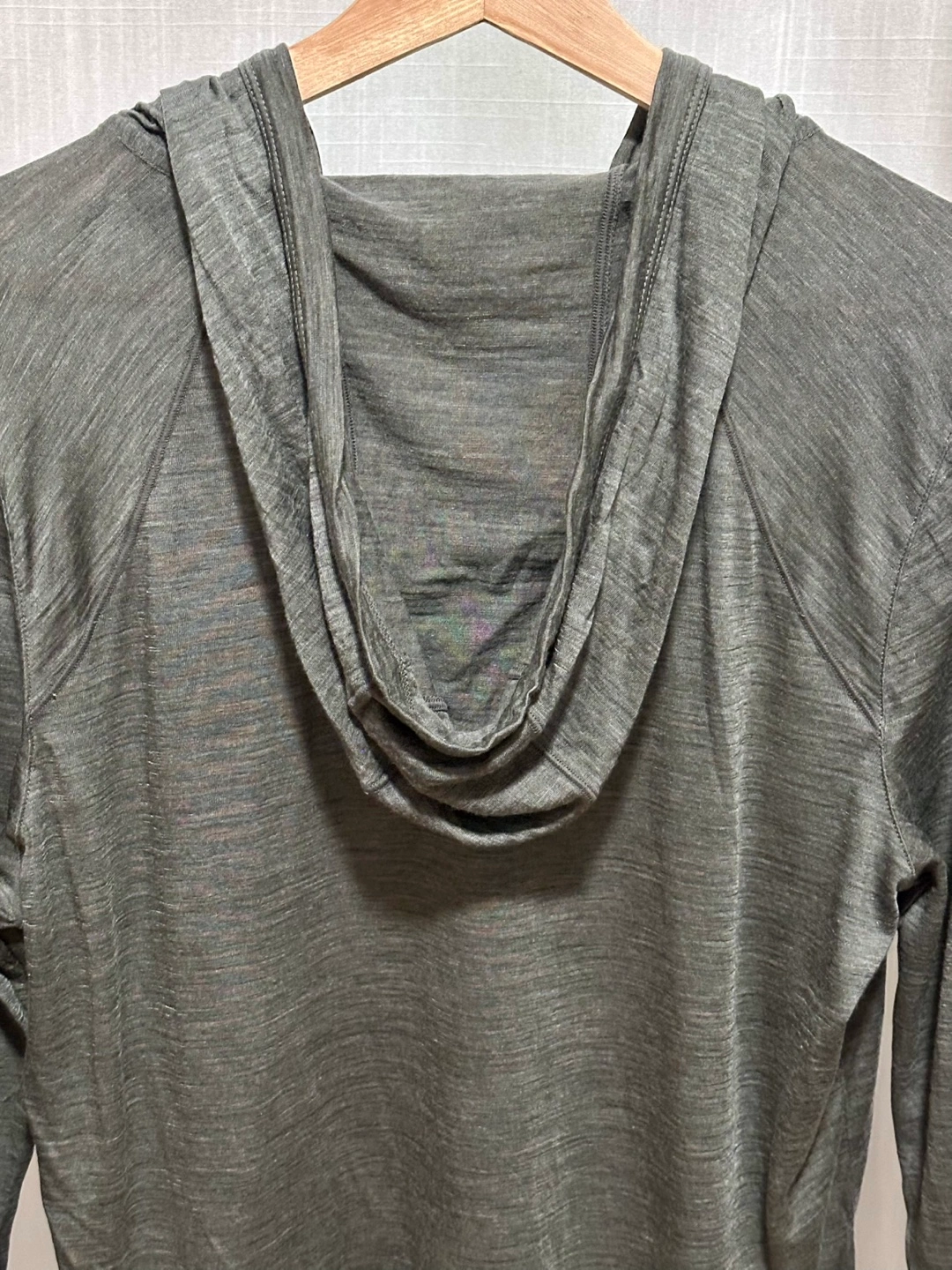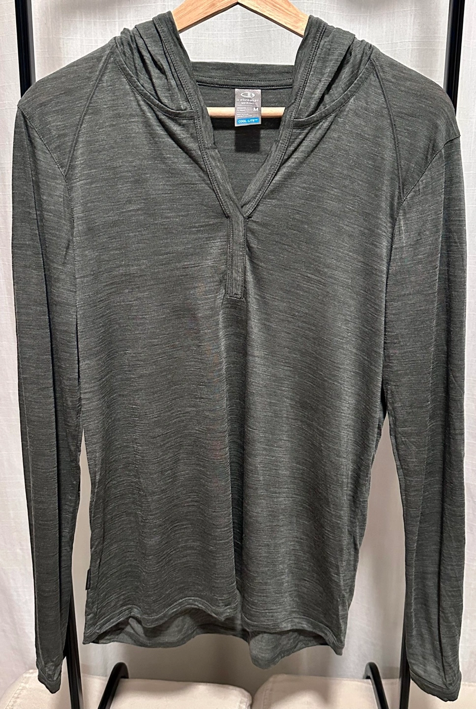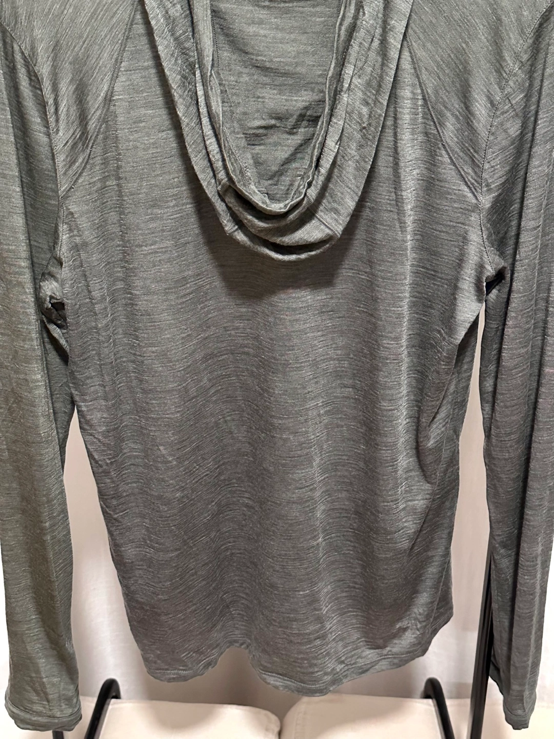 Size Medium. Dark grey. Long sleeves. Hooded. Half-slit open placket. Soft merino fabric. Excellent for layering.