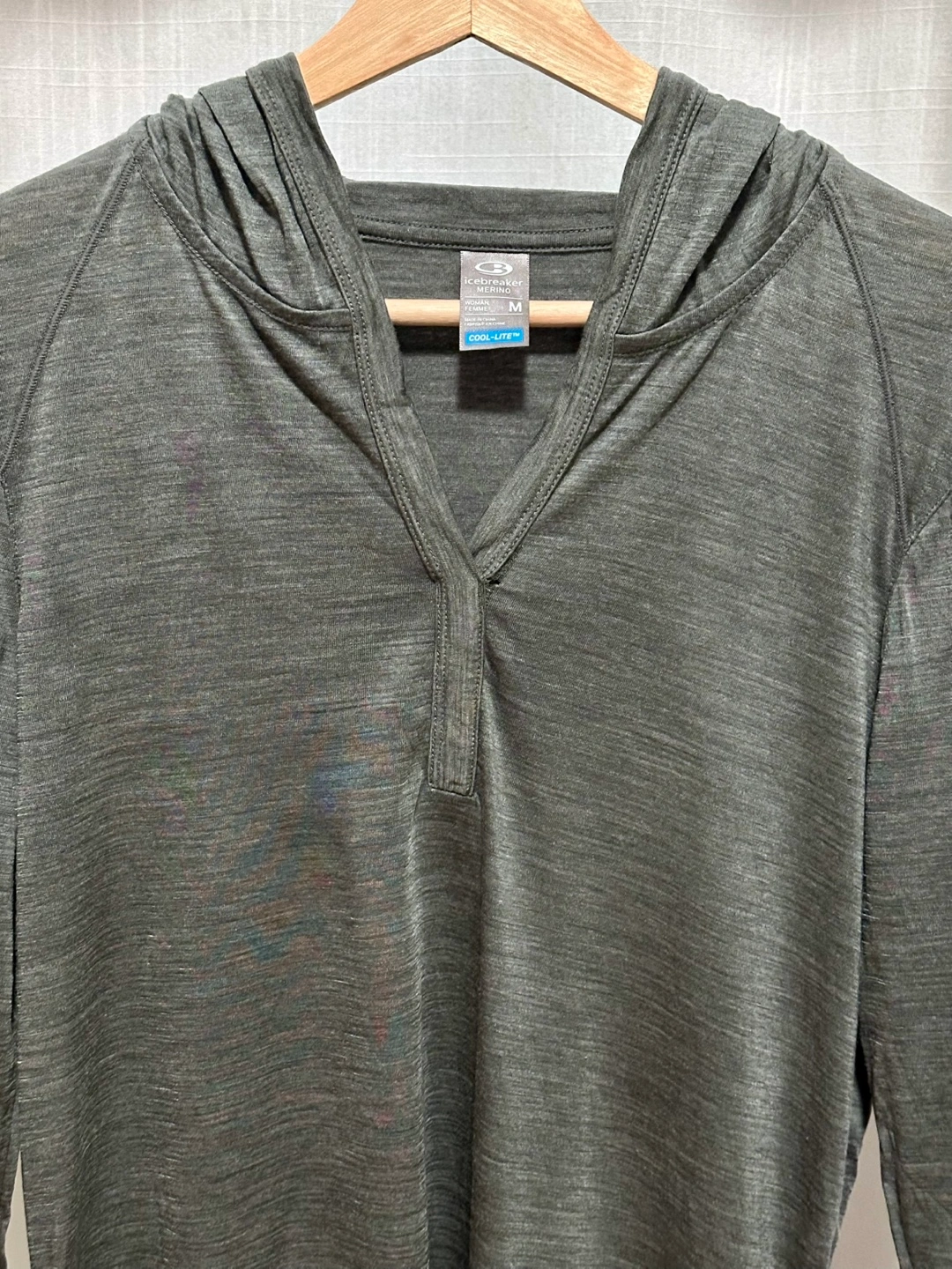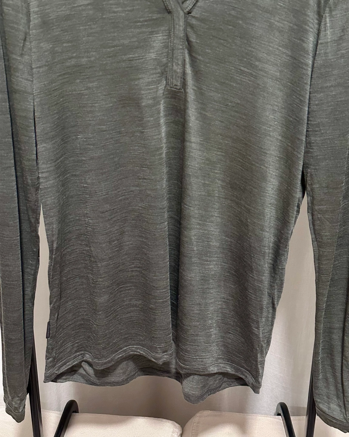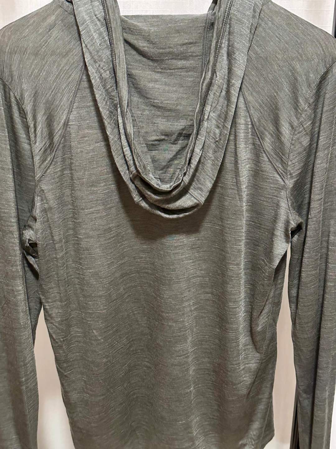 Size Medium. Dark grey. Long sleeves. Hooded. Half-slit open placket. Soft merino fabric. Excellent for layering.