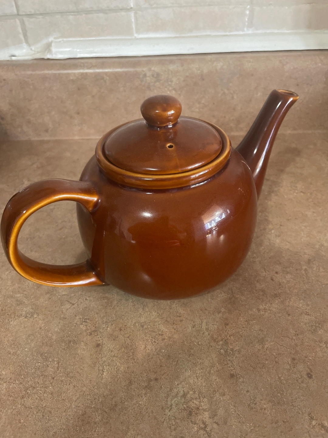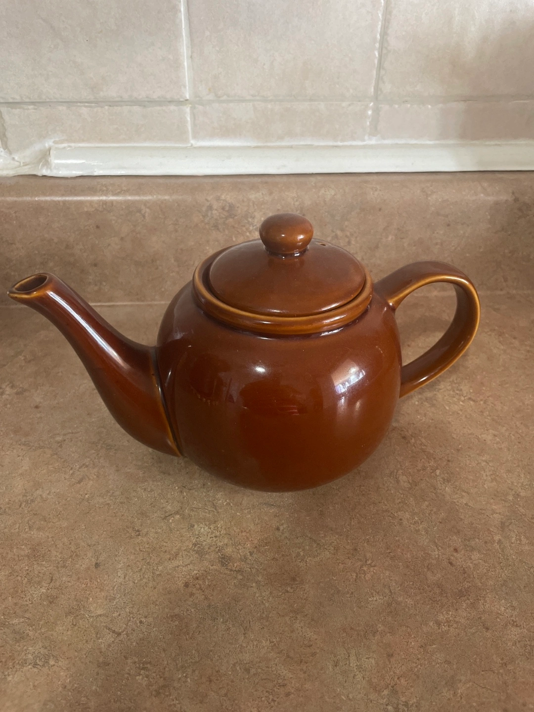 Small brown teapot. Perfect for a cozy afternoon tea. Simple design. Lid included.