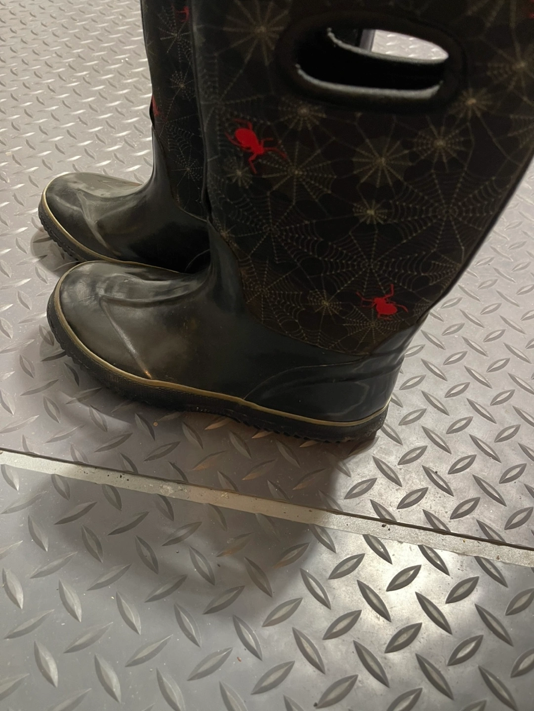 Used kids' Bogs rain boots. Black with a spiderweb and spider design. Size 3. Good for puddles and rainy days.