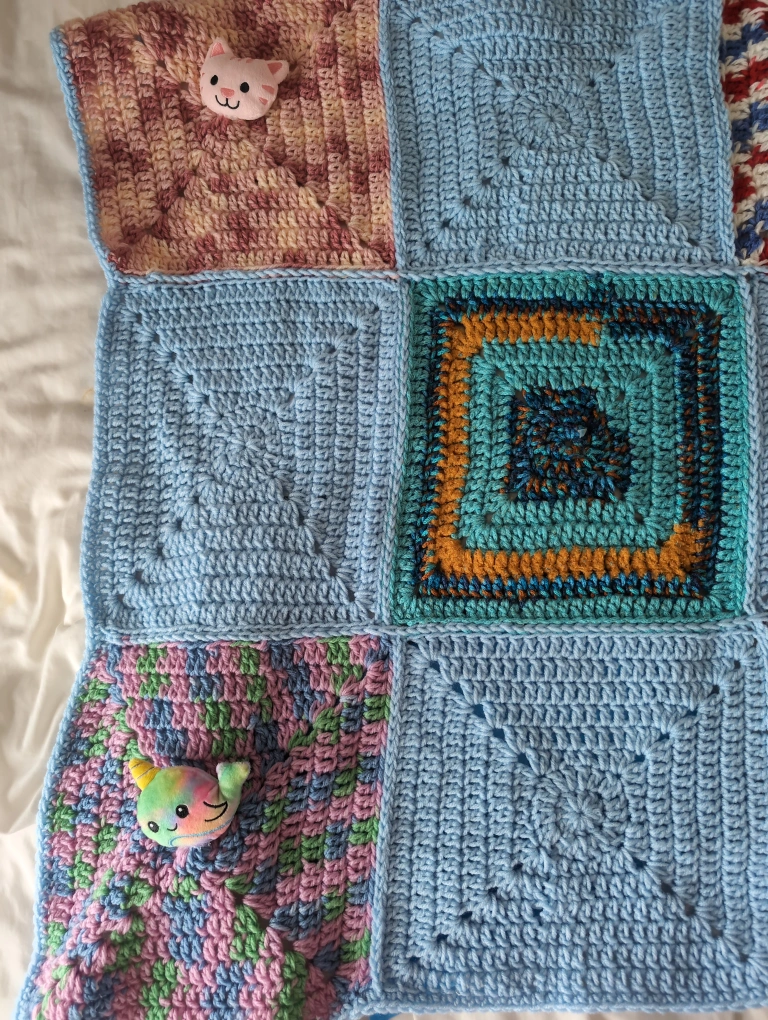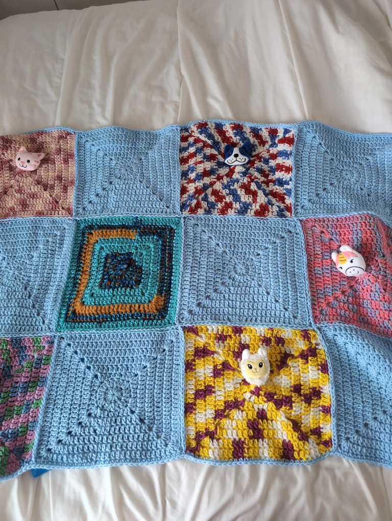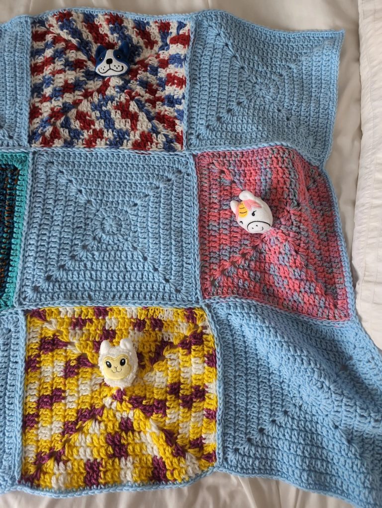 Adorable baby blanket, crocheted squares in various colors and patterns. Includes small stuffed toys. Perfect for a baby shower gift. Handmade!