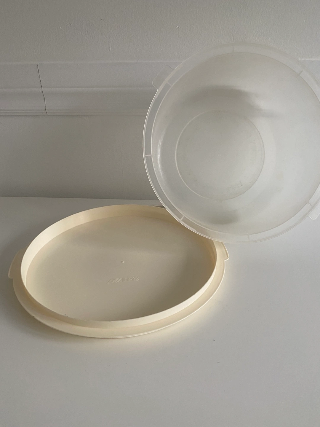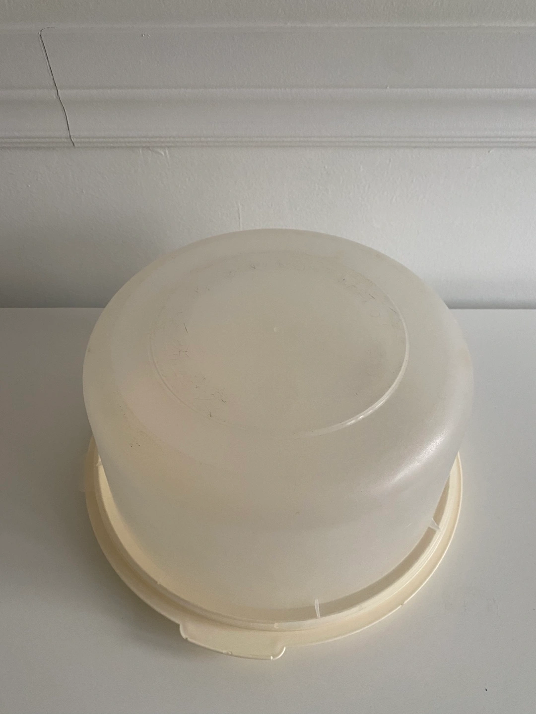 •Excellent condition, clean, no breakage •Vintage Tupperware cake carrier •Round Clear plastic dome •off-white base bottom •Diameter: 12” Aprox. Height: 6” Aprox. •smoke-free, pet-free environment **Location: Jane & Lawrence**