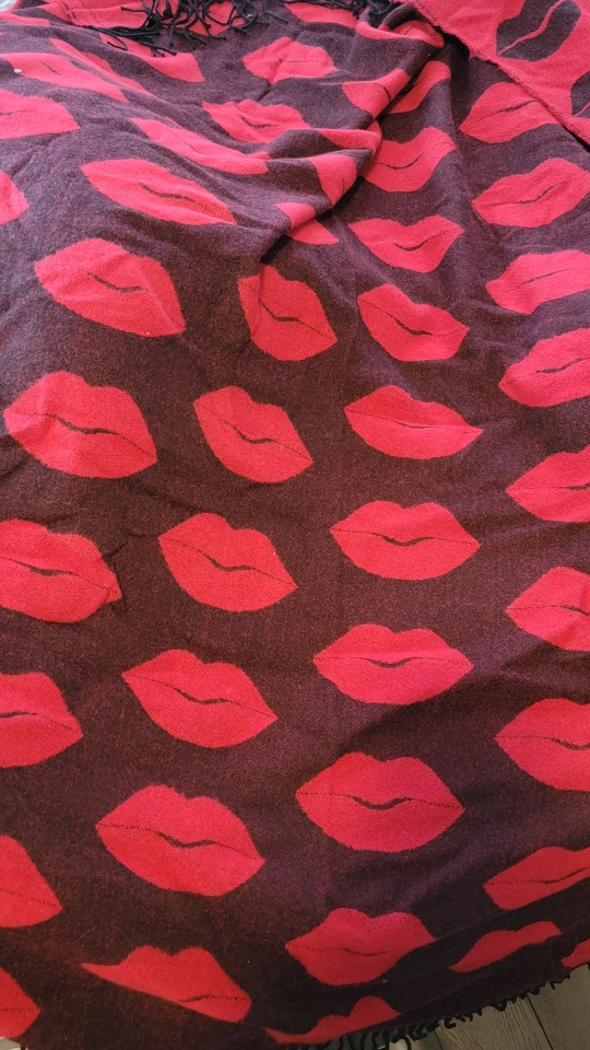 Cozy throw blanket. Features a red and black lip print. Soft material. Fringe detail. Perfect for snuggling.