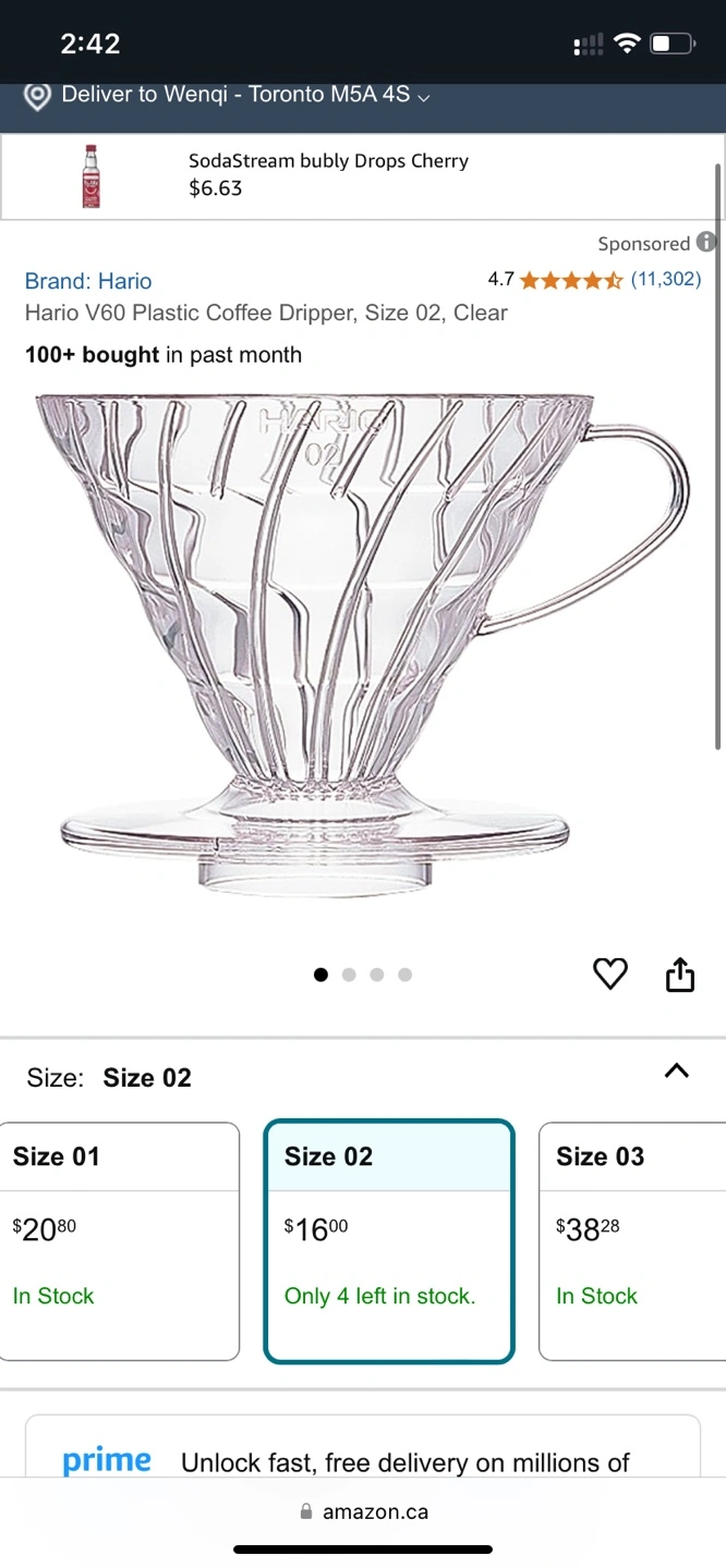 Clear plastic Hario V60 pour over coffee dripper. Size 02. Made in Japan. Gently used. I can meet at Adelaide east & sherbourne or king station most of the days!