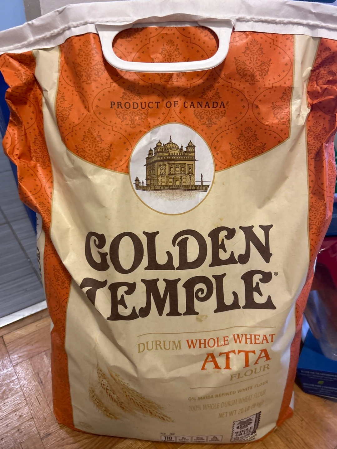 20lb bag of Golden Temple Durum Whole Wheat Atta Flour. Product of Canada. 0% Maida refined white flour, 100% whole durum wheat flour.