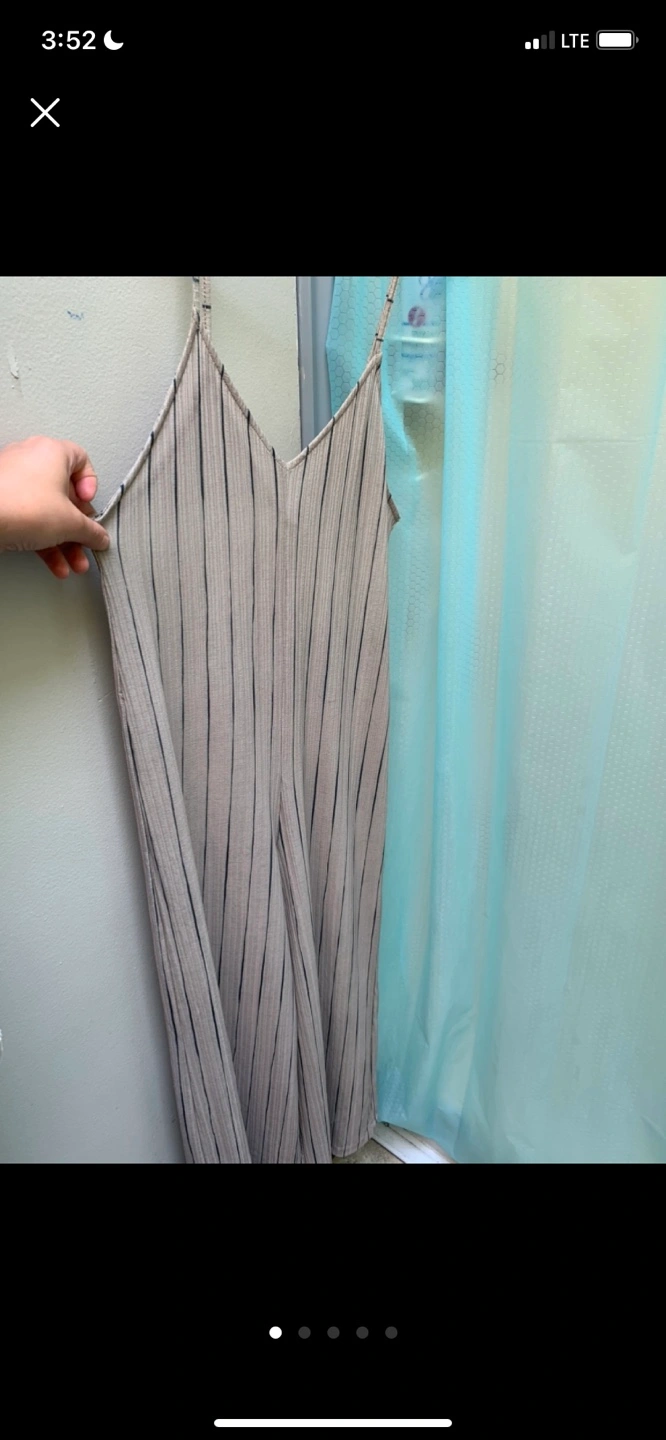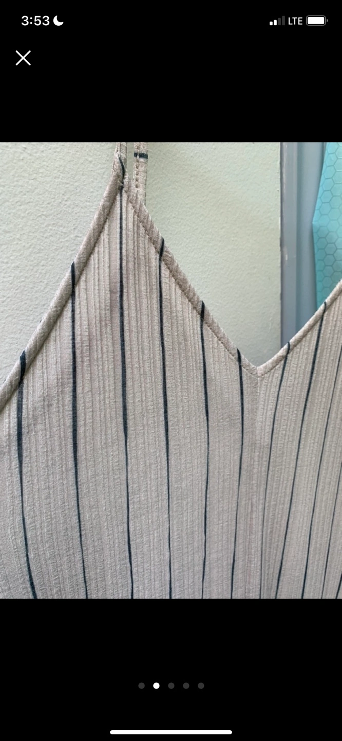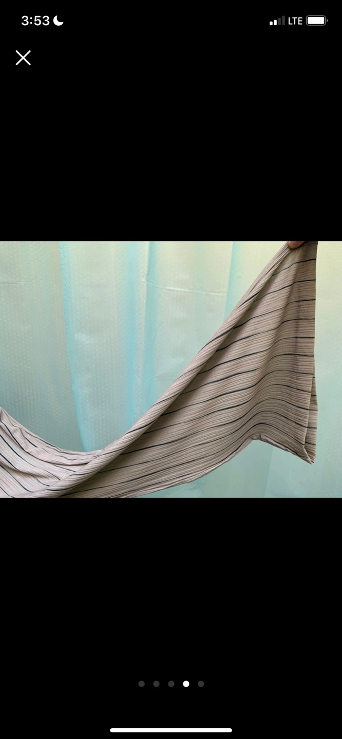 Quite thin and flowy, polyester blend. Would be great for hot weather and around the house. Light beige with navy blue stripes, has a bit of stretch.