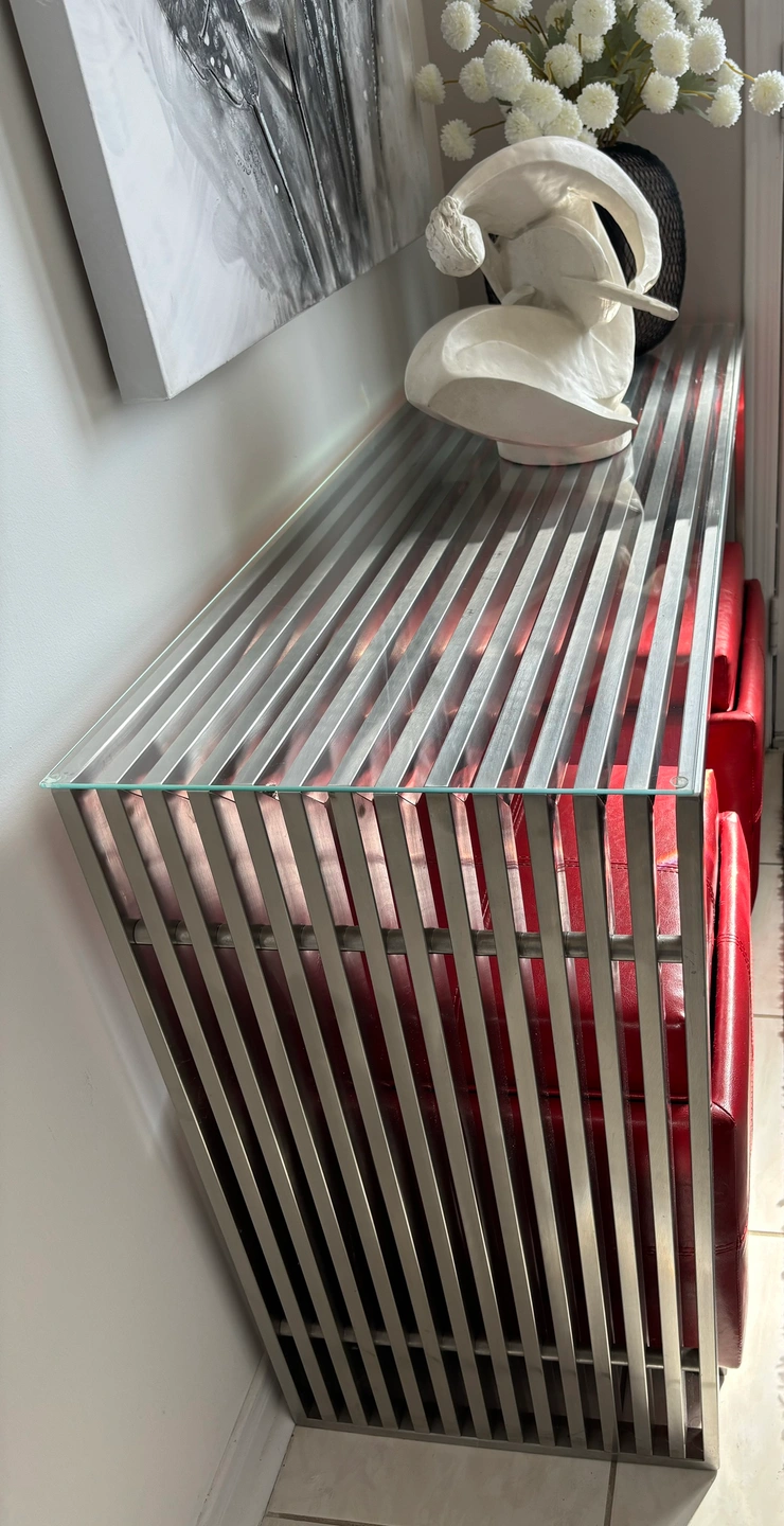 Stainless steel sofa table or foyer table excellent condition from very clean smoke free home. Will remove when no longer available. Last picture is a bench from Wayfair to see price. TABLE ONLY