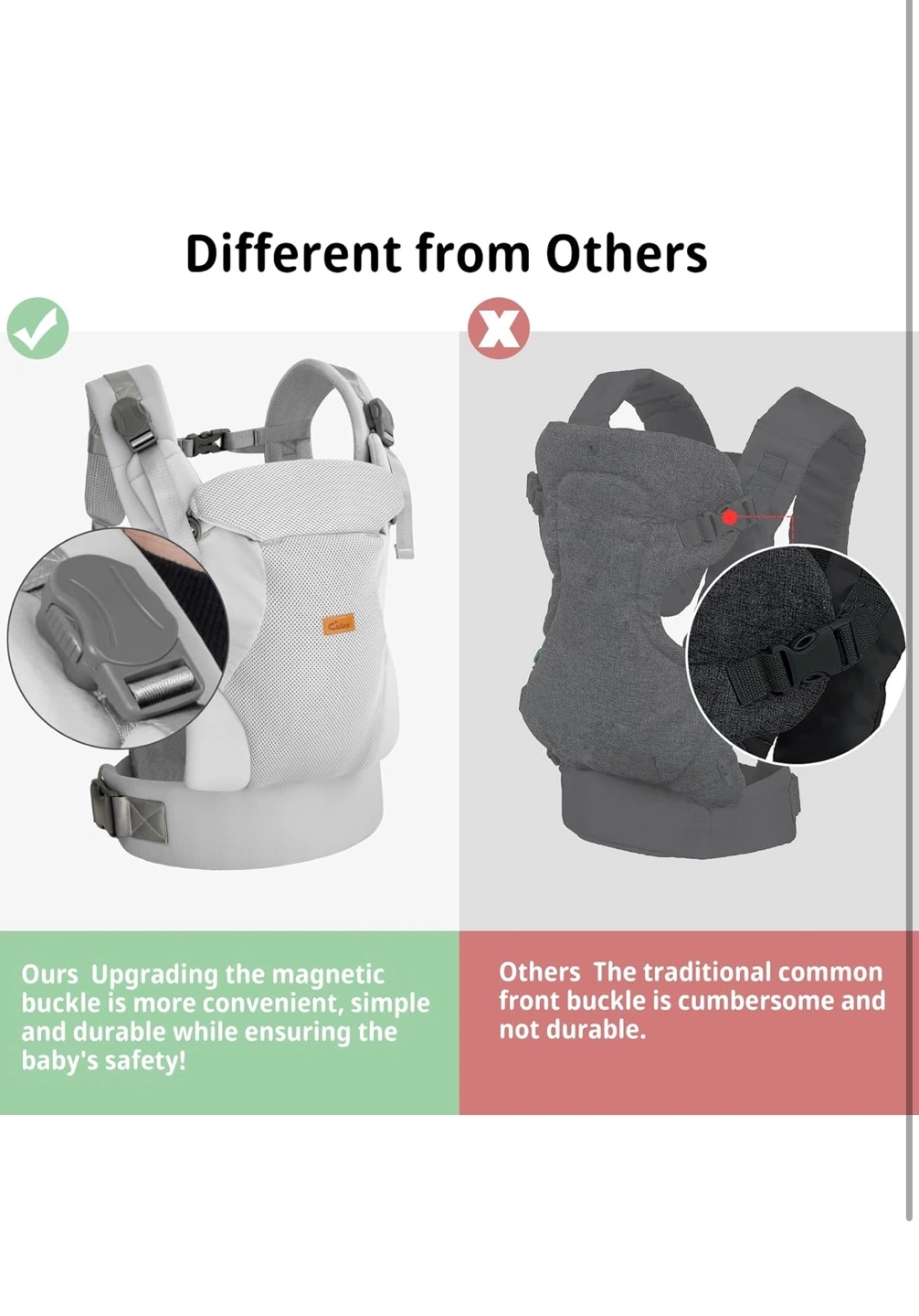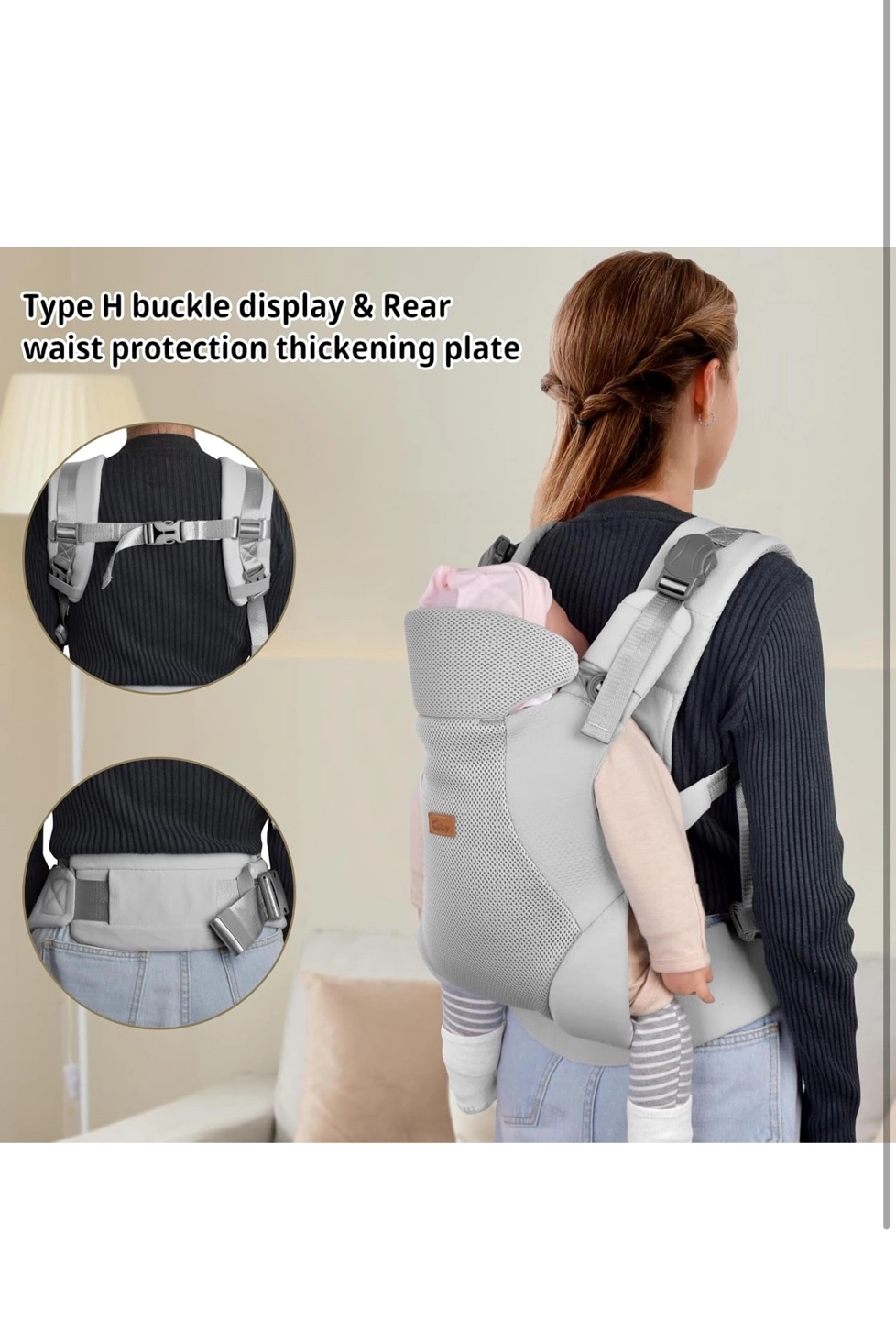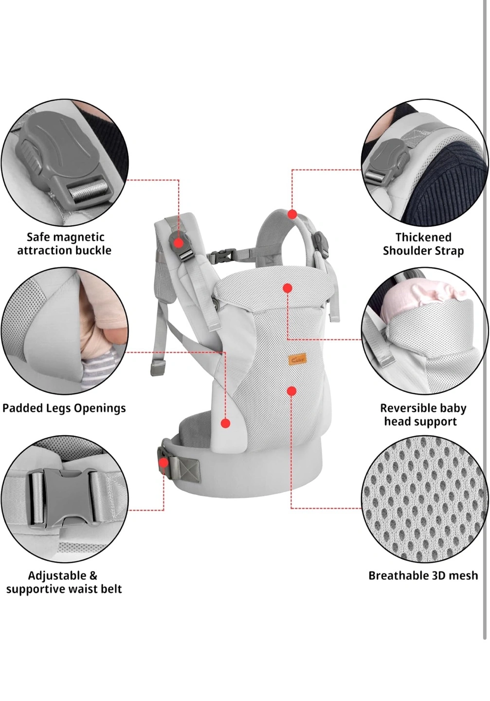 Lightweight baby carrier. Features breathable 3D mesh, padded leg openings, and adjustable waist belt. Reversible baby head support. Safe magnetic buckle. Thickened shoulder straps. Hip-healthy ergonomic design.