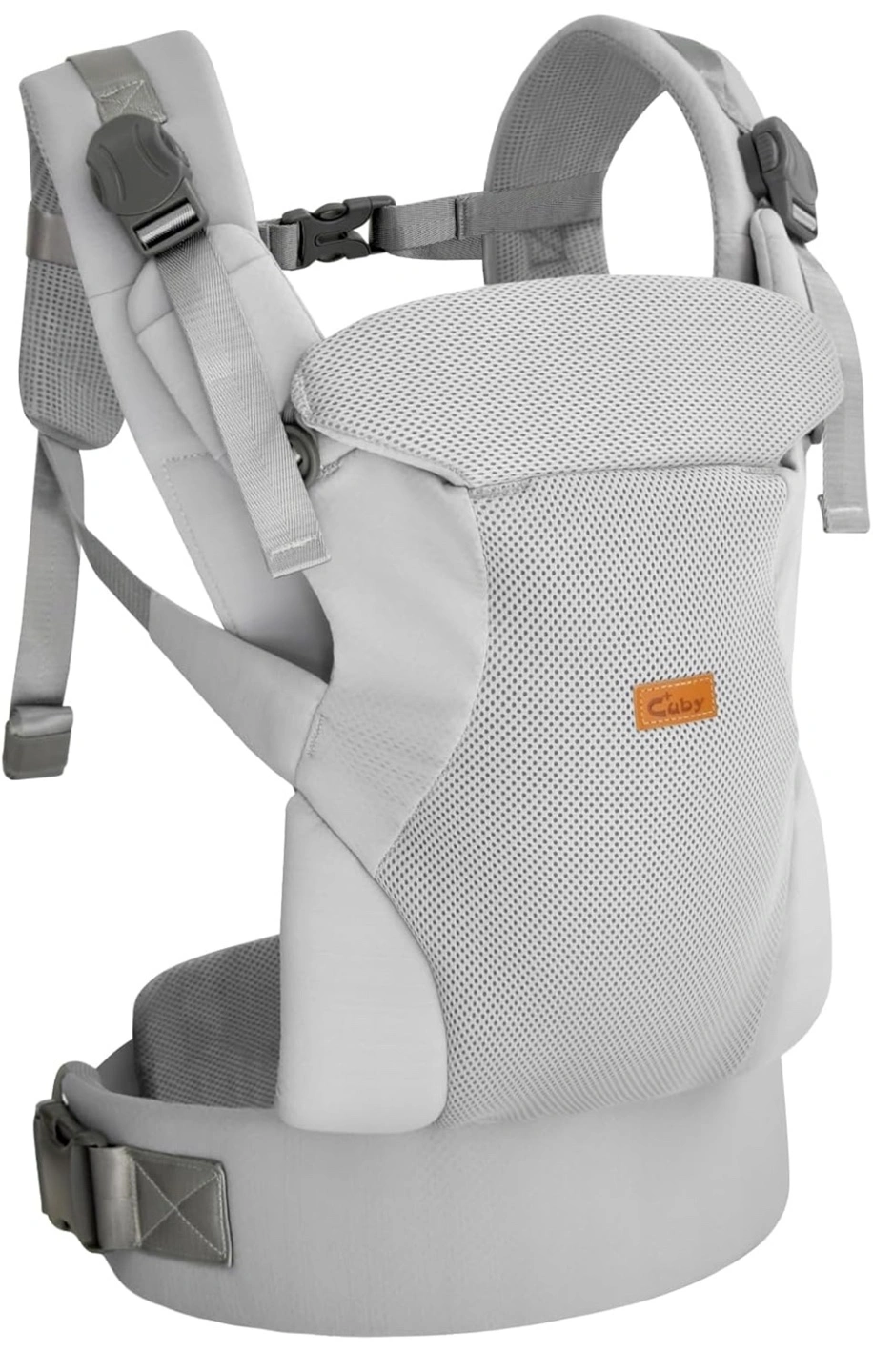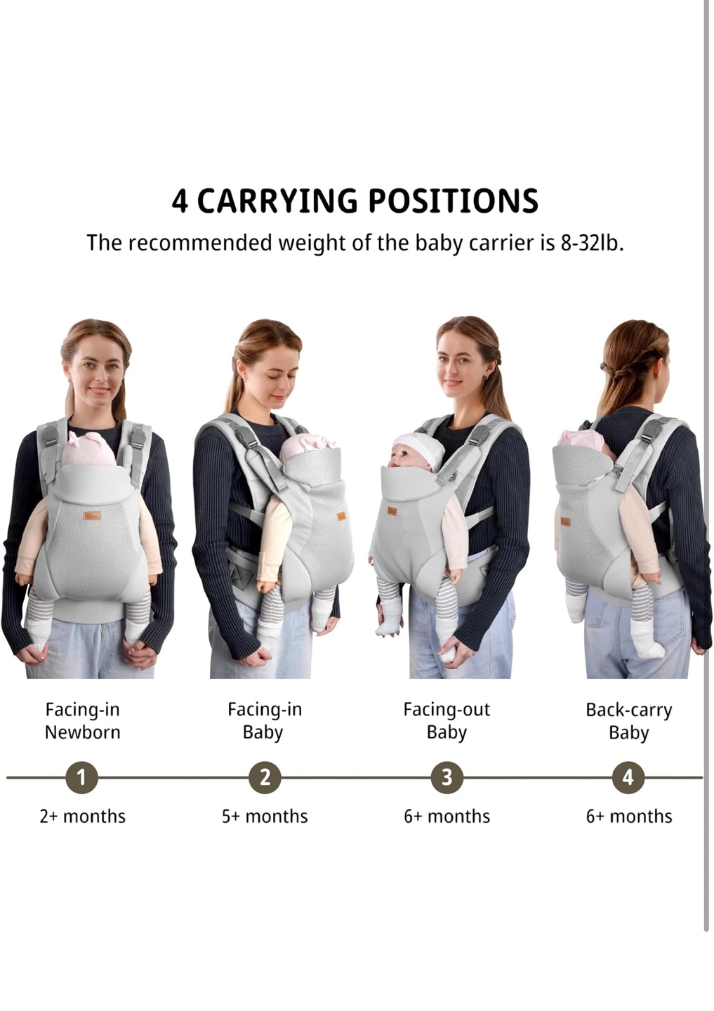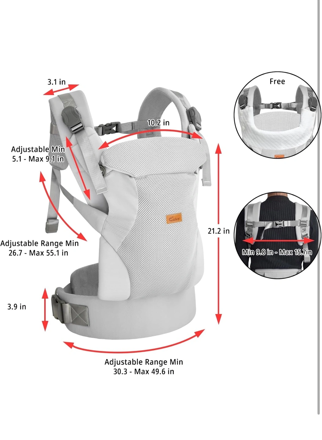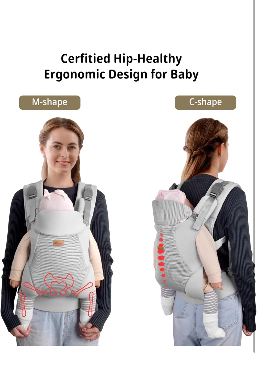 Lightweight baby carrier. Features breathable 3D mesh, padded leg openings, and adjustable waist belt. Reversible baby head support. Safe magnetic buckle. Thickened shoulder straps. Hip-healthy ergonomic design.