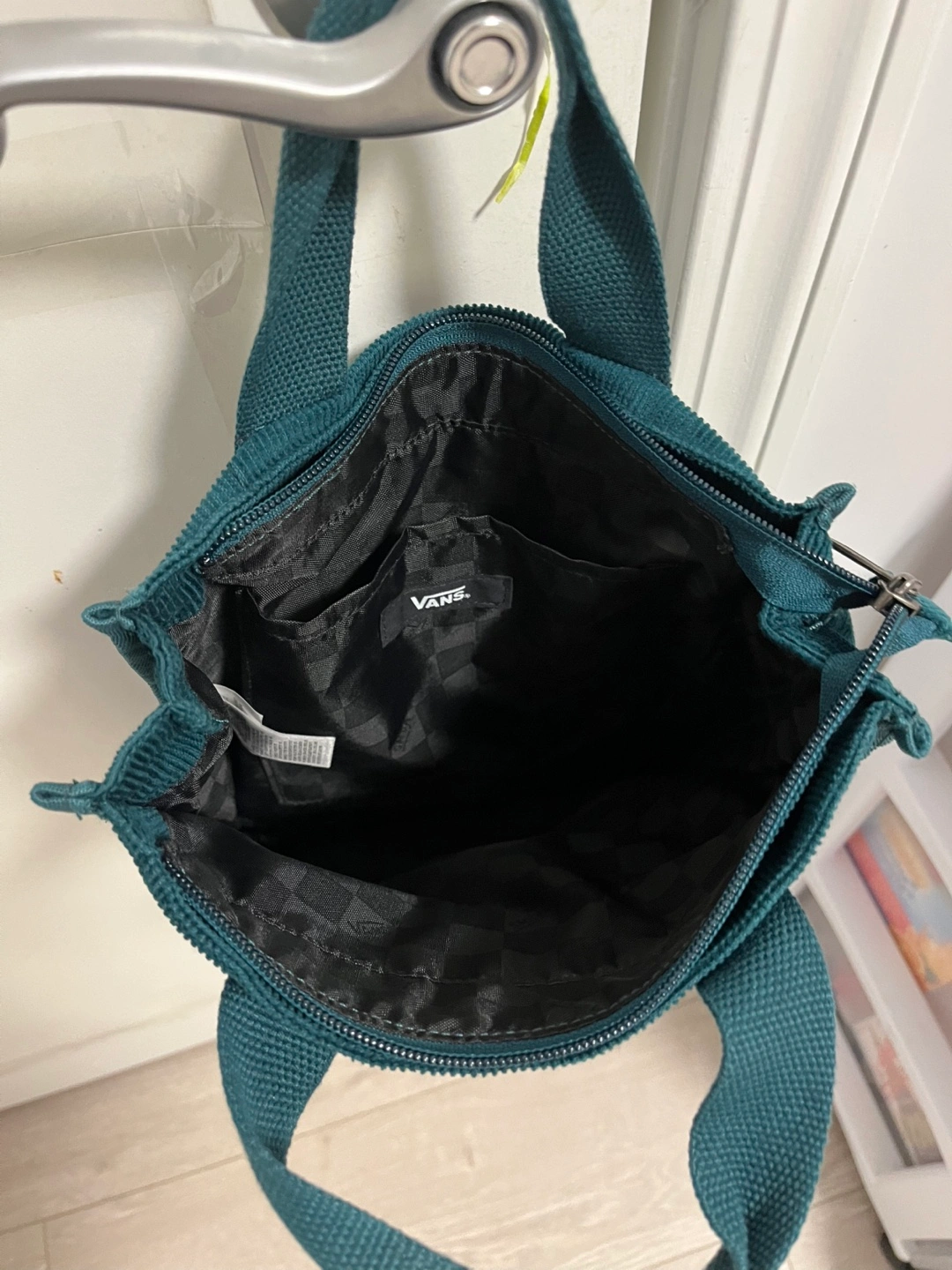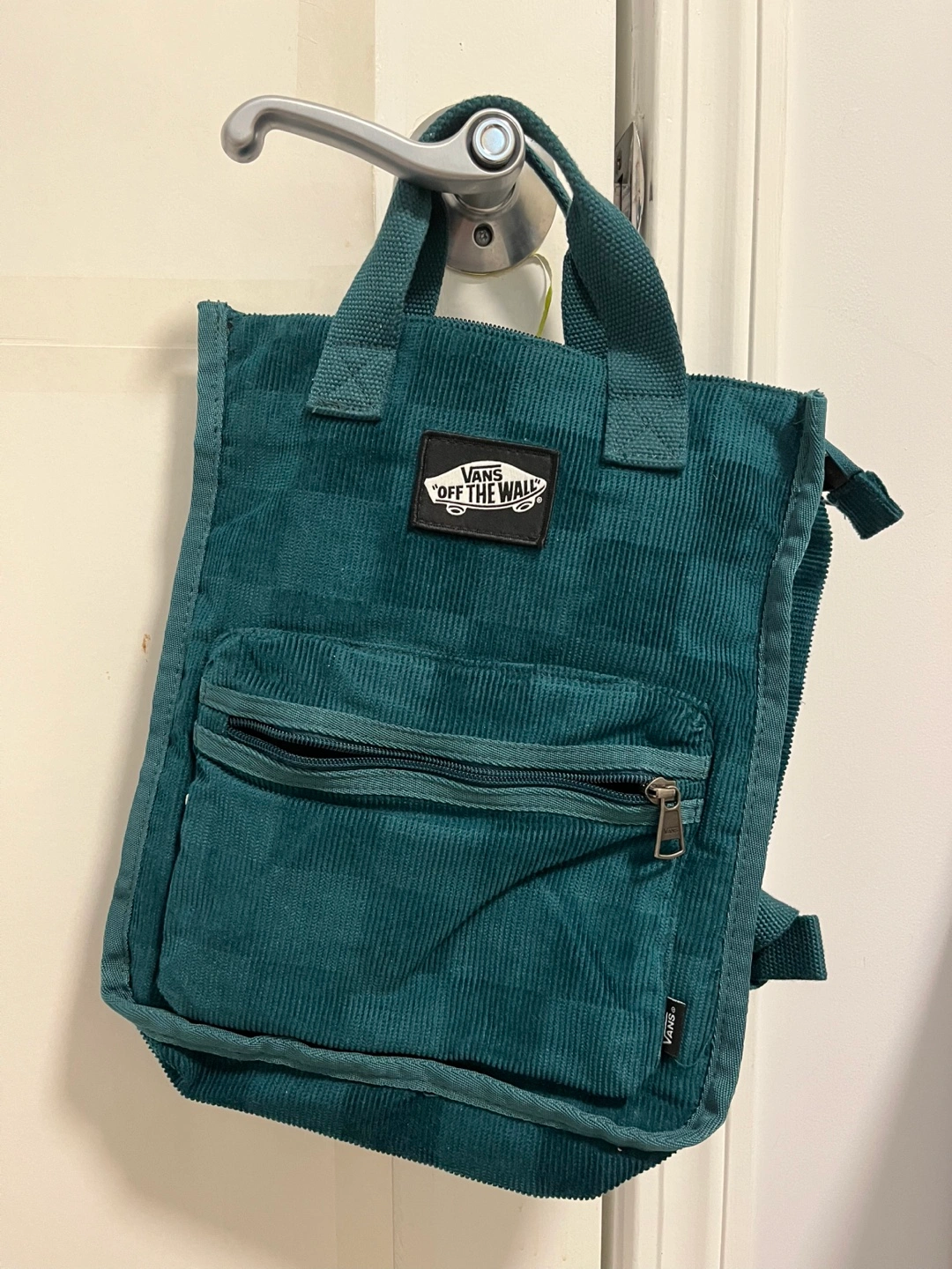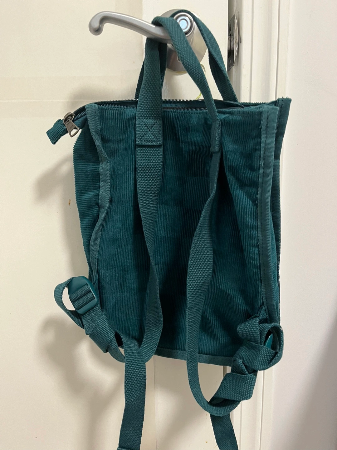 Mini backpack. Teal corduroy material. Top handle and adjustable shoulder straps. Zipper closure. Interior pocket. Excellent condition.