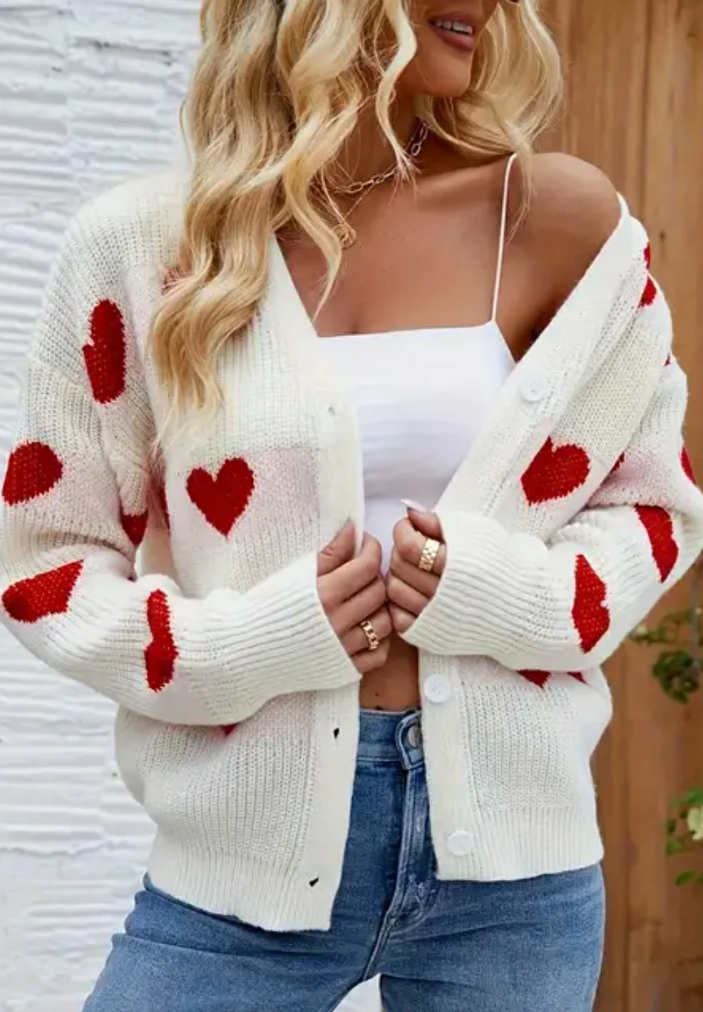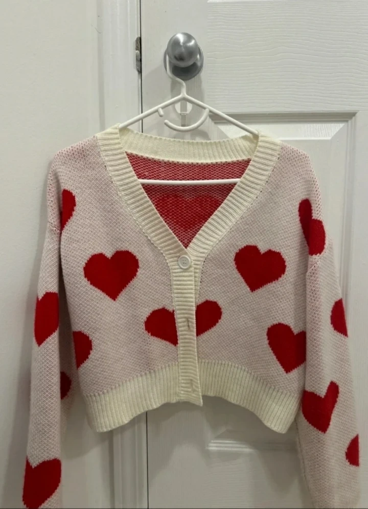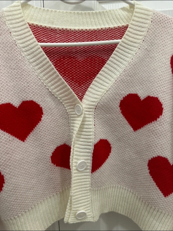 Cozy and cute cream coloured cropped cardigan. Features a v-neck, button closure and red hearts scattered throughout.