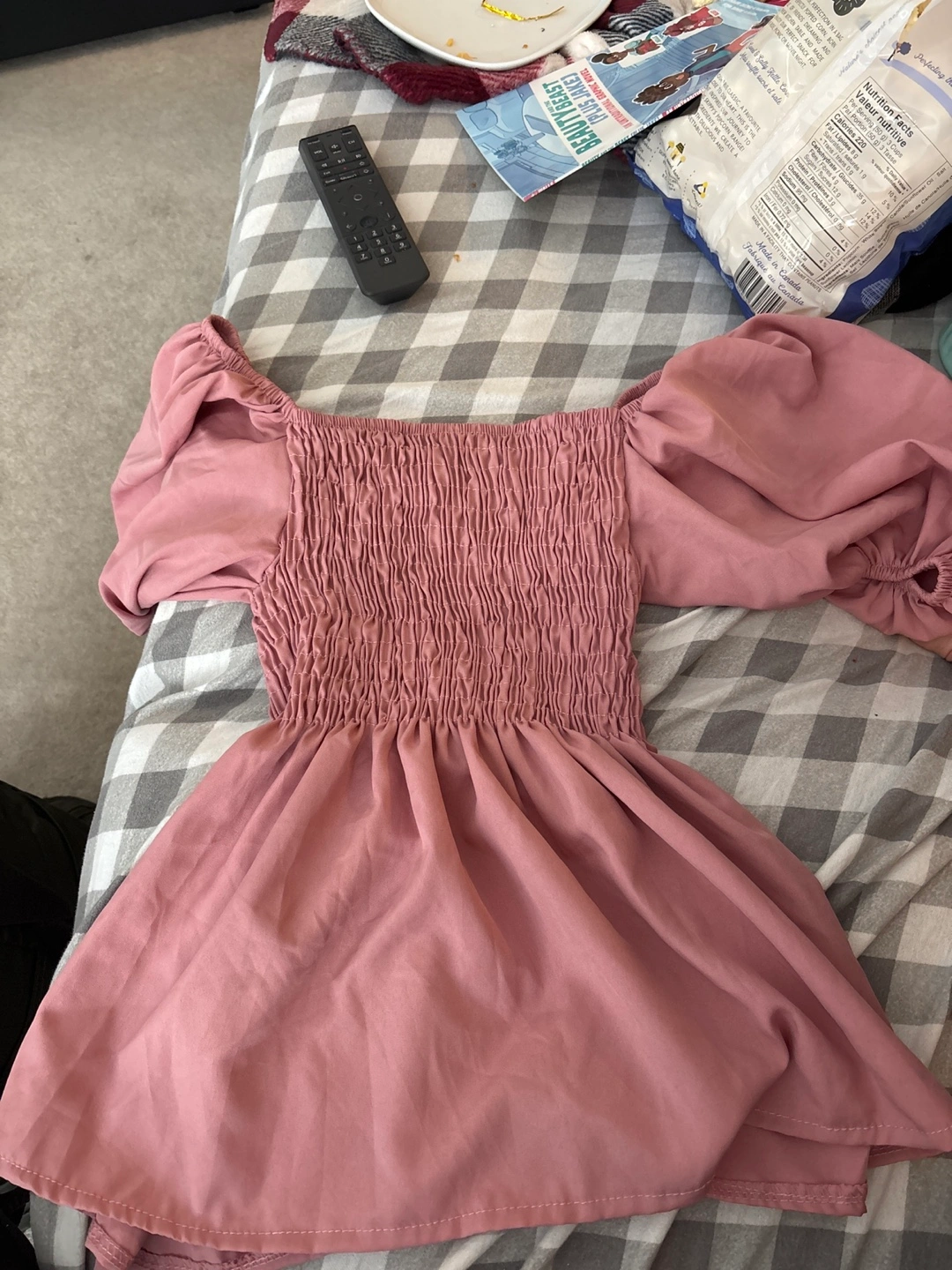 Adorable dusty rose blouse. Off-the-shoulder style. Three-quarter sleeves. Smocked bodice. Flowy fit. Perfect for spring or summer. Handmade.