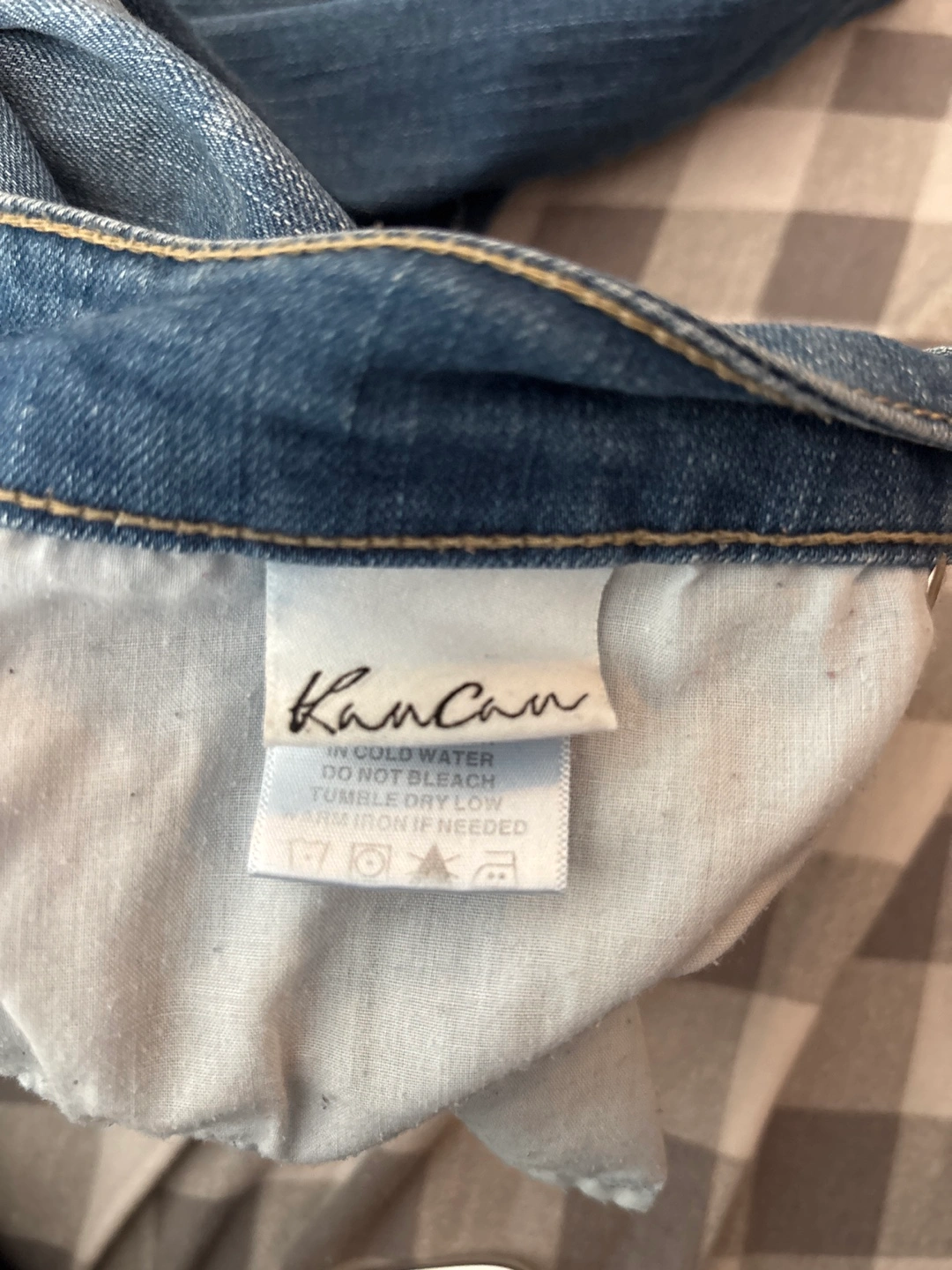 KanCan jeans, size W11/29. 71% cotton, 17% polyester, 12% rayon. Machine wash cold, do not bleach, tumble dry low, iron if needed. Designed in Los Angeles, USA.