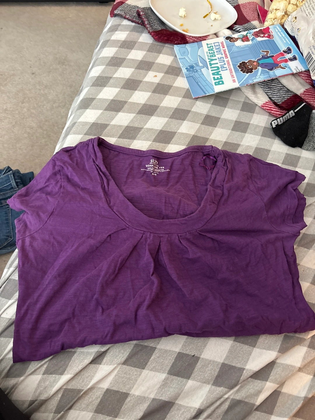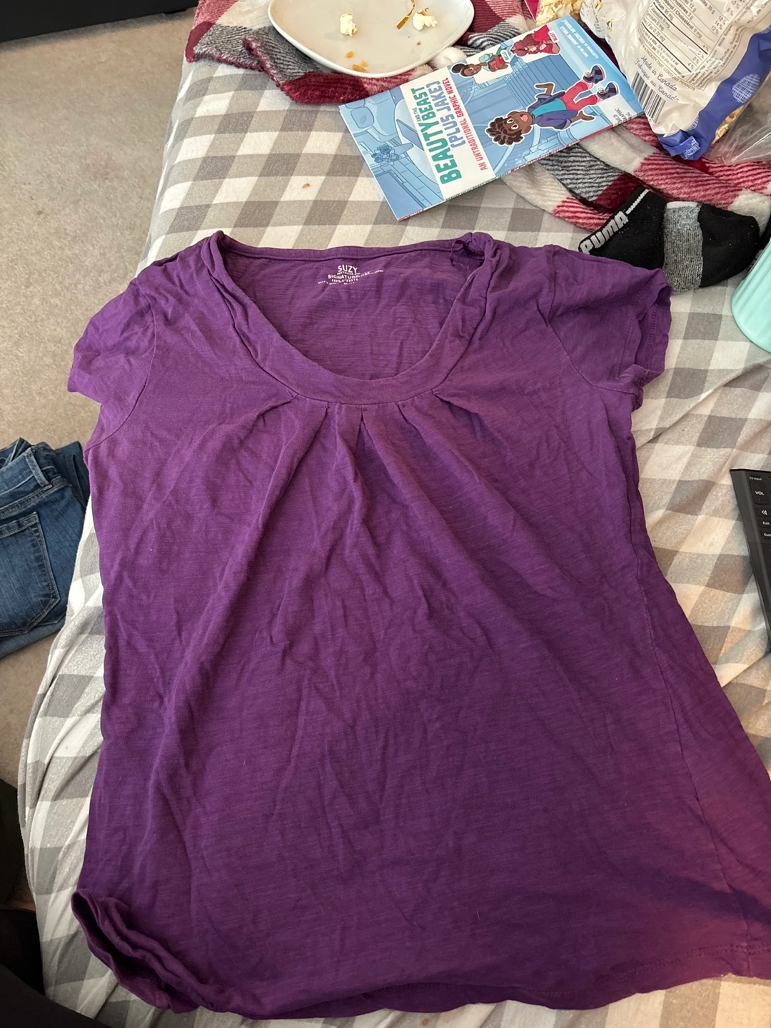 Women's purple scoop neck t-shirt. Short sleeves. Slightly gathered neckline. Good condition.