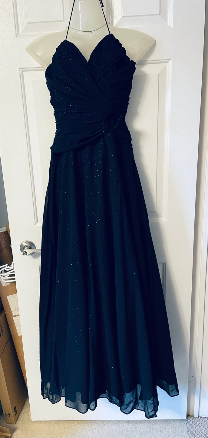 Shimmering black formal dress, floor length, A line, a little flair with four layers of slips and twill for elegant look. Strapless sweetheart neckline. Made in Canada. Size 6