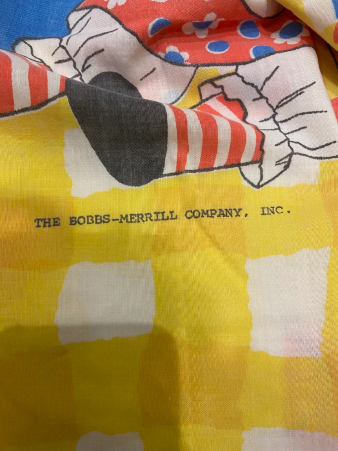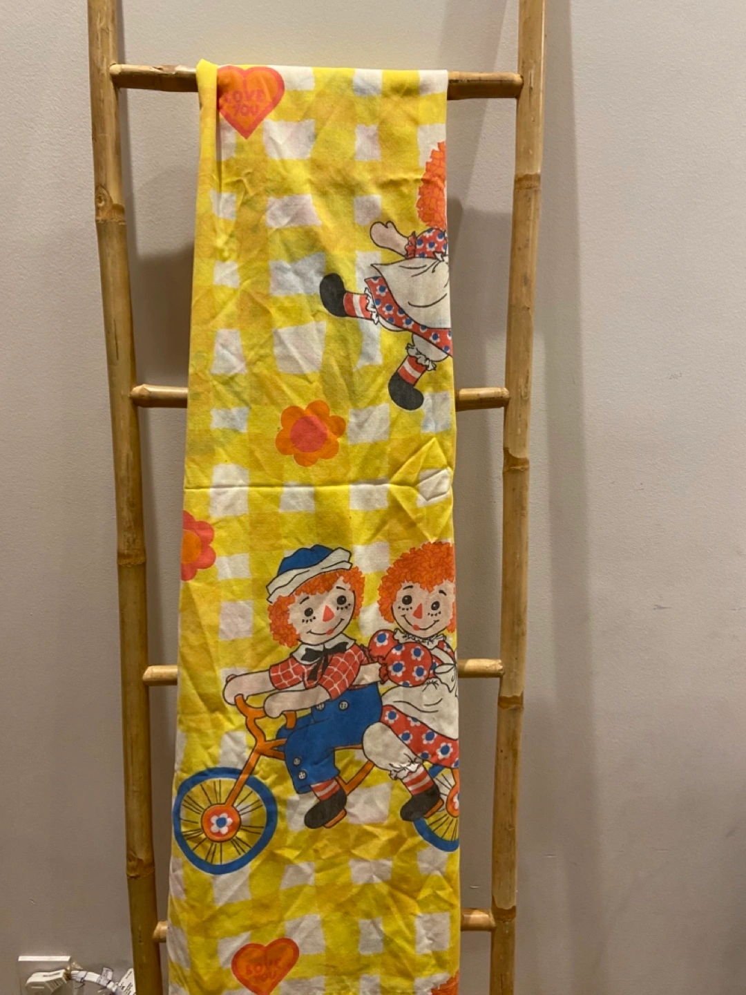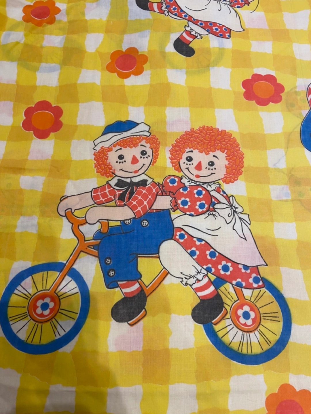 Adorable vintage twin flat sheet. Features Raggedy Ann and Andy. Yellow gingham background. Some minor fading. Excellent for collectors or a child's room. Broadview and Danforth