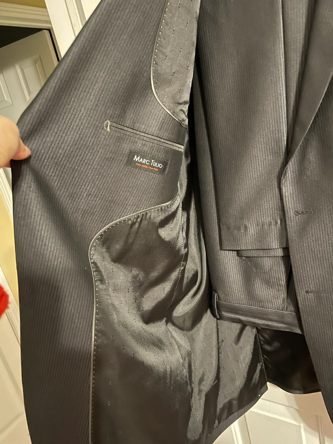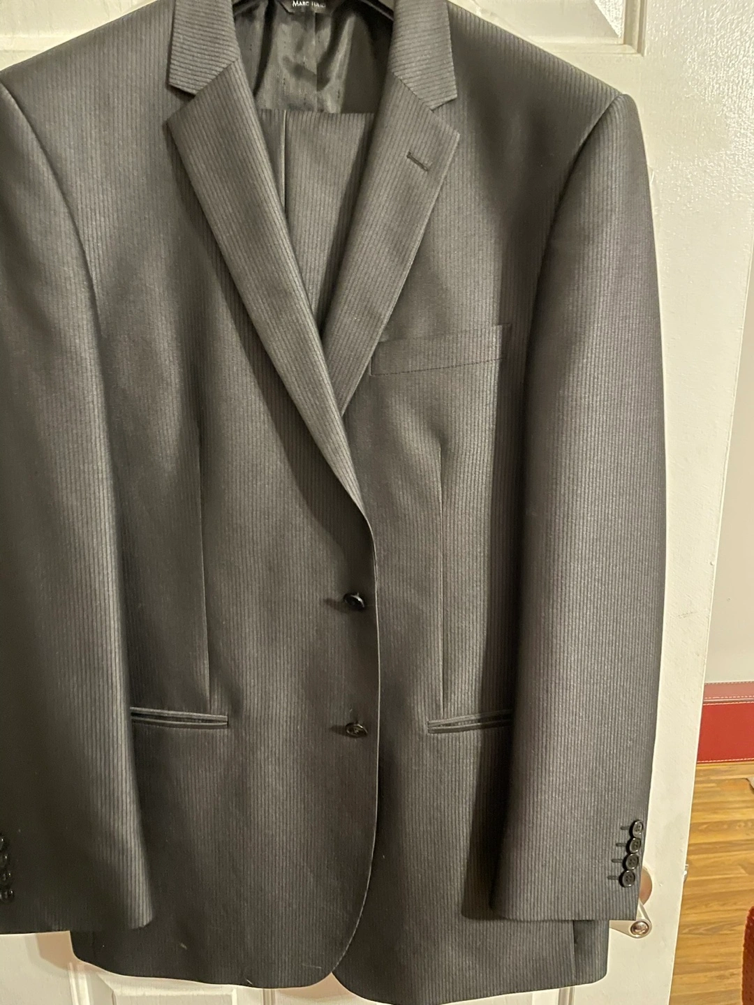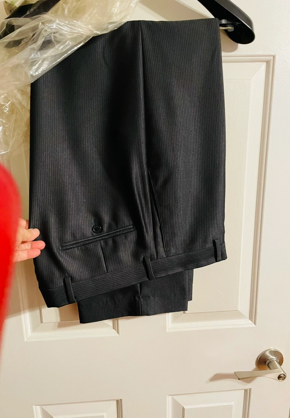 Dark grey pinstripe 2piece suit. MicroTech performance fabric. Excellent condition. Great for any formal occasion like prom, wedding, special soirée