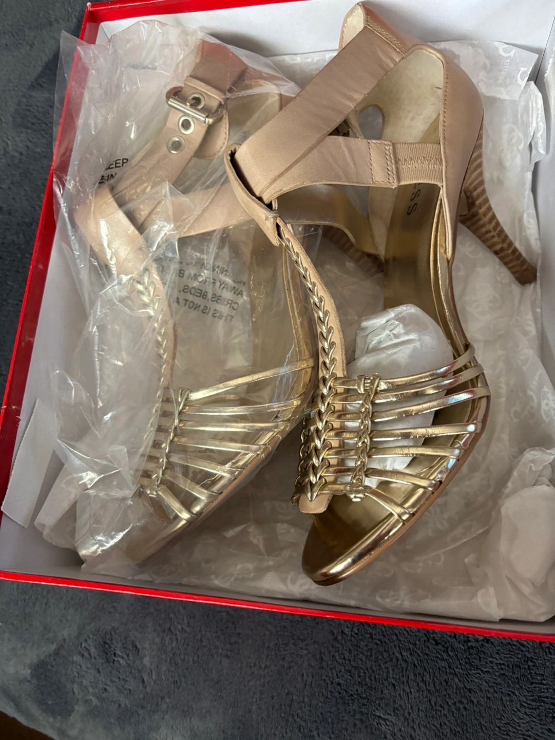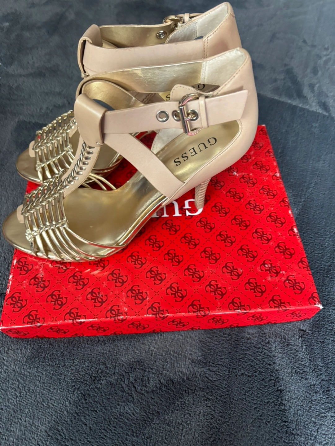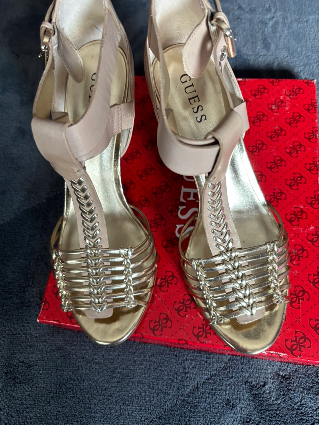 Beautiful gold Guess heels. Size 8.5 Nude coloured straps. Gold detailing. In original box.