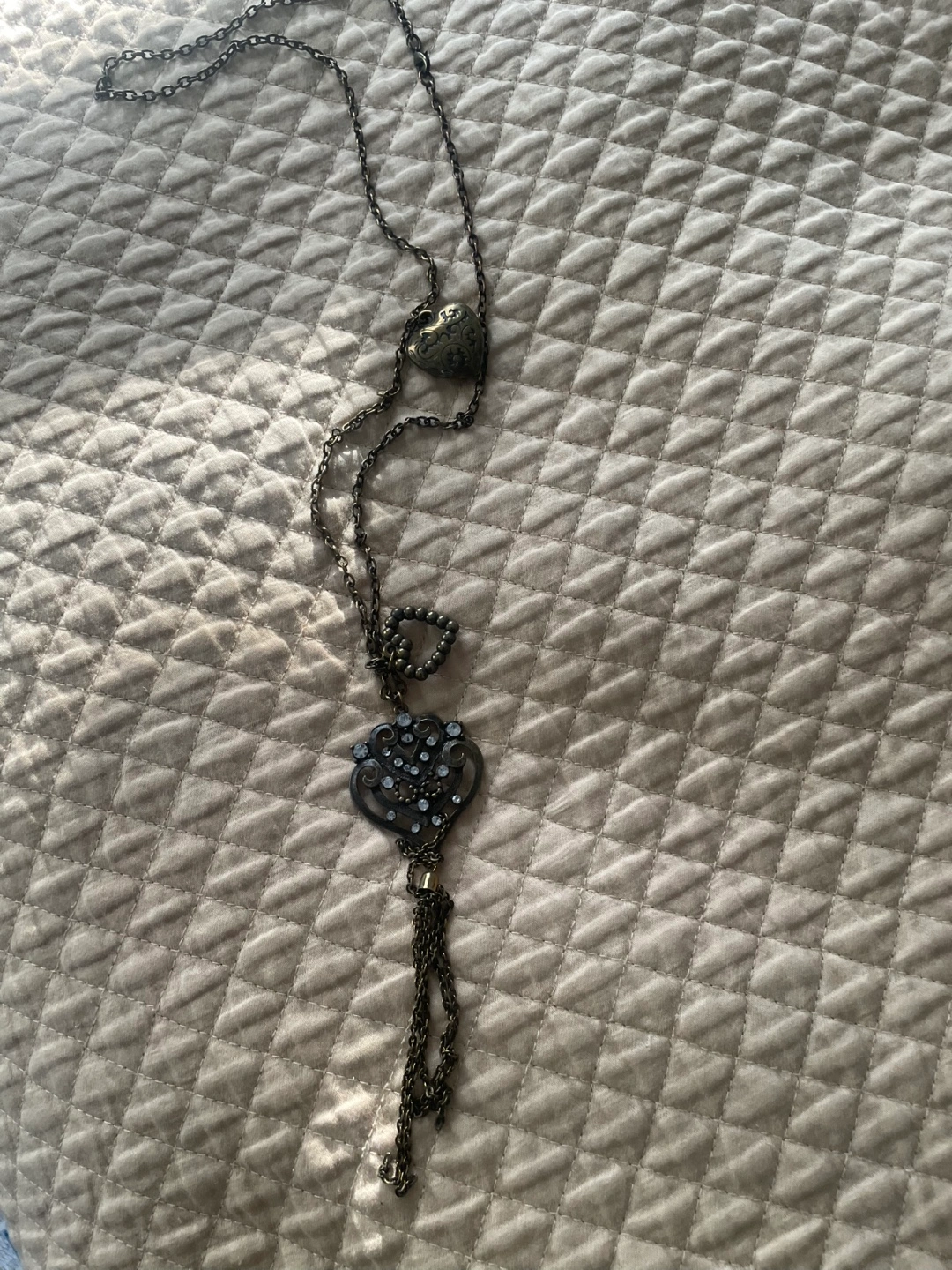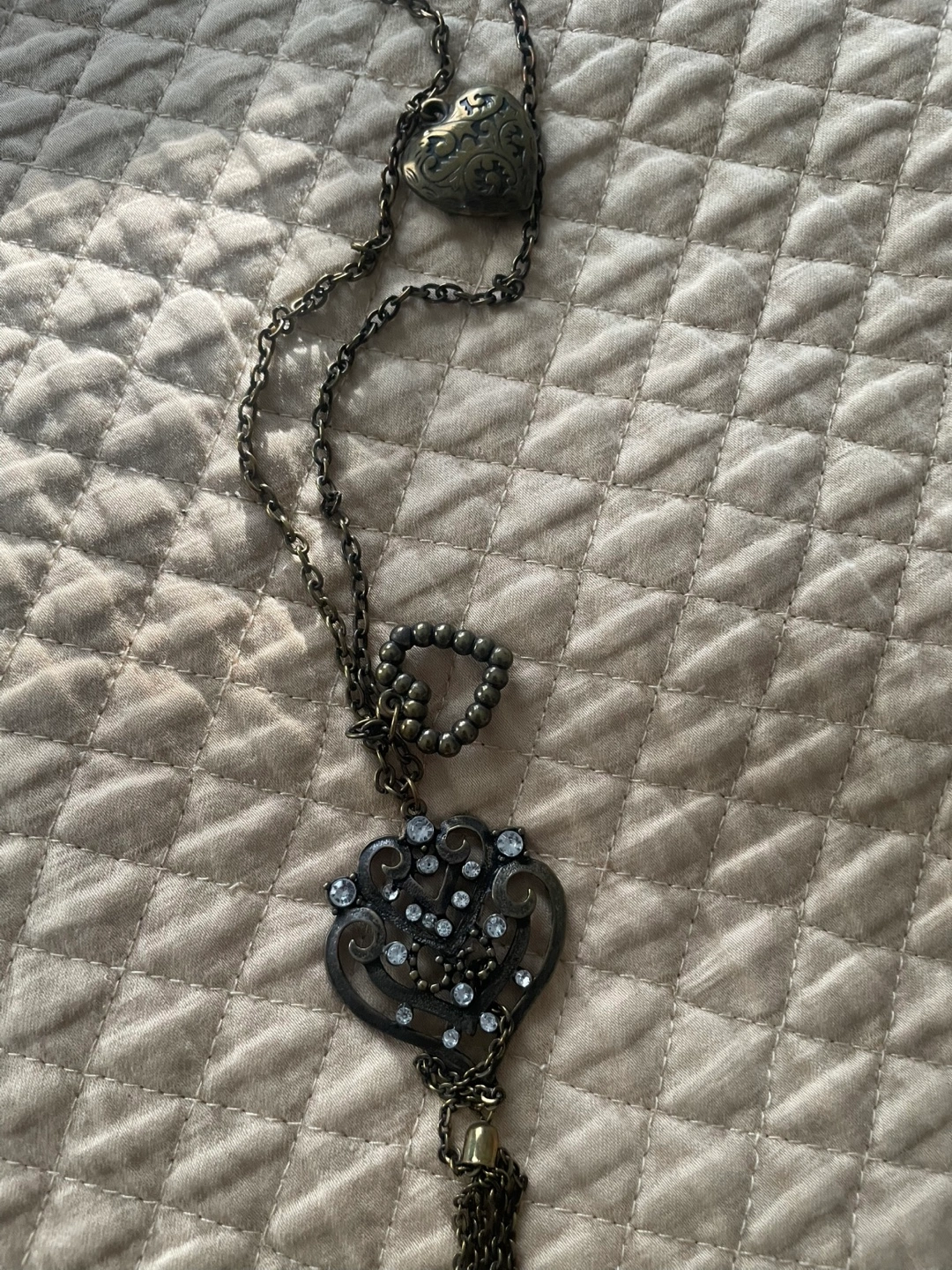 Beautiful layered necklace. Features two antique-style heart pendants, one with clear rhinestone accents and a tassel. Long chain, perfect for layering.
